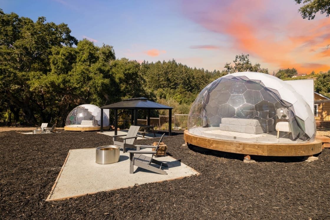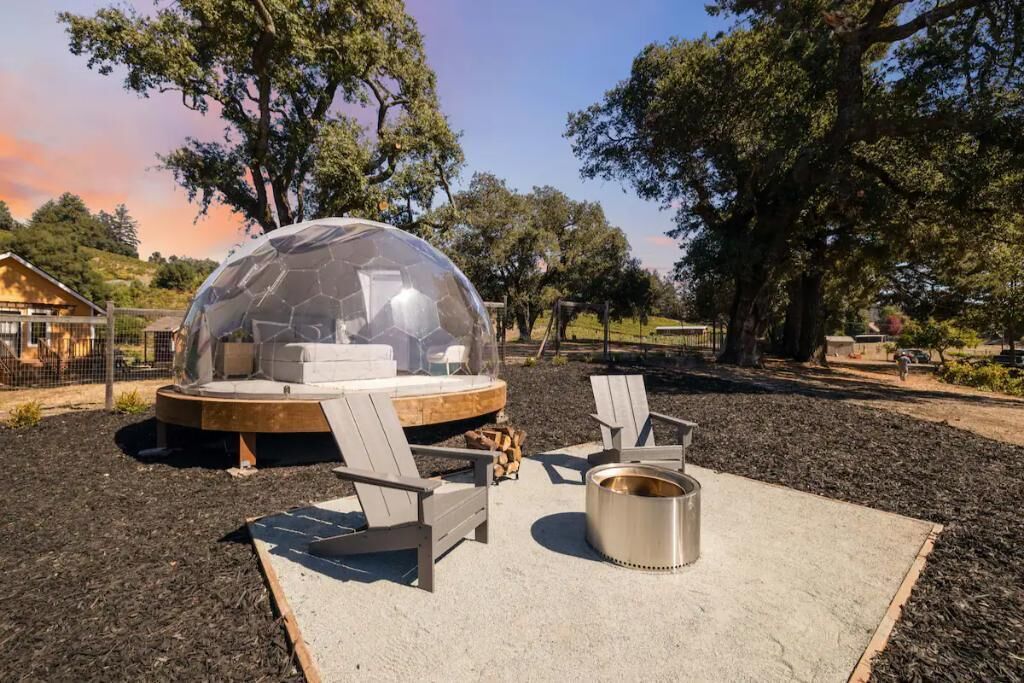 Our unique accommodation includes one inviting dome equipped with a fire pit area, comfortable seating, and a queen-sized bed, perfect for two adults and 1-2 children. The domes share a well-equipped bathroom and feature a covered pergola for memorable outdoor experiences. Guests can also enjoy a picnic table, Park Style BBQ, and campfires. Please note that pets are not allowed.