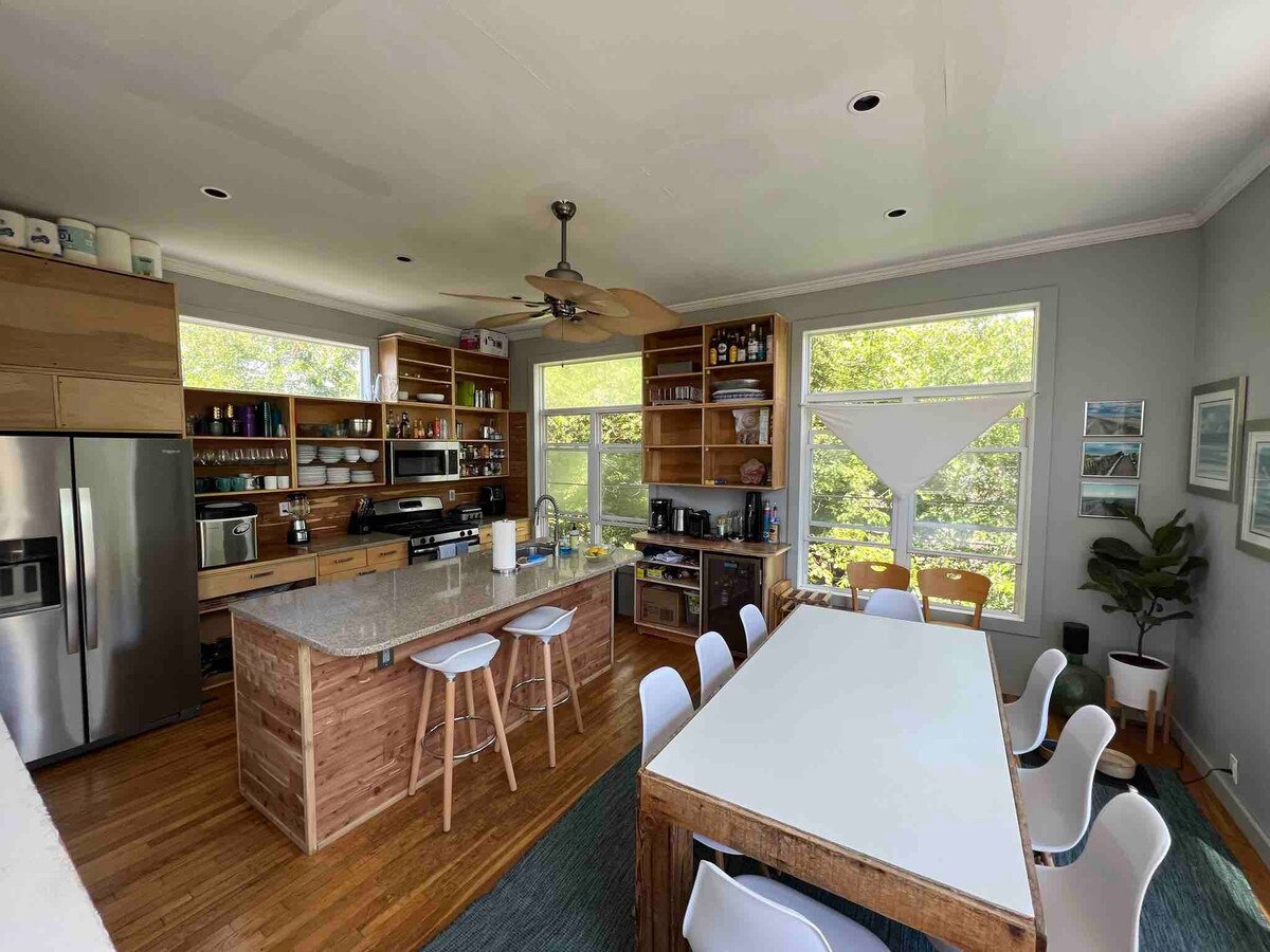 You'll have full access to the kitchen, with space in the fridge and cabinets set aside just for your stuff, a big living room, a dining room, two shared bathrooms, outdoor shower and huge deck for outdoor dining. Most families who stay here end up eating semi-together, taking turns at the stove and sometimes even sharing dishes. More often than not, the kids band together to paint seashells, and everyone wanders over to the dock for sunset, grown-ups with grown-up drinks in hand. Sometimes families go to the beach together, and sometimes everyone does his/her own thing. And don't forget Wednesday night movies at the fire house!