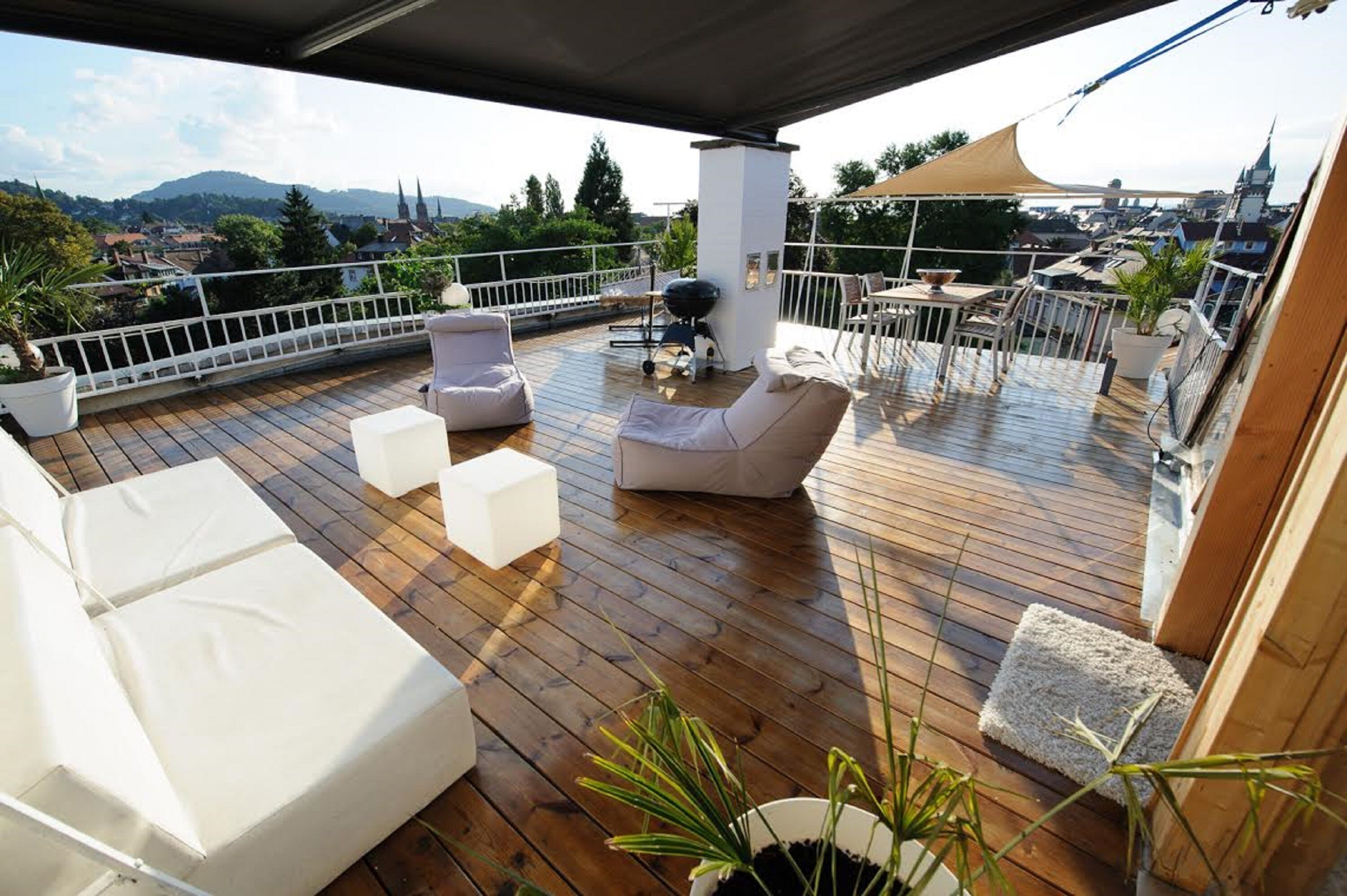 The double bedroom has direct access to the shower room with toilet and bidet. From the small east terrace you have a beautiful view of the nearby Schlossberg in the east, and of the nearby Münster tower.
