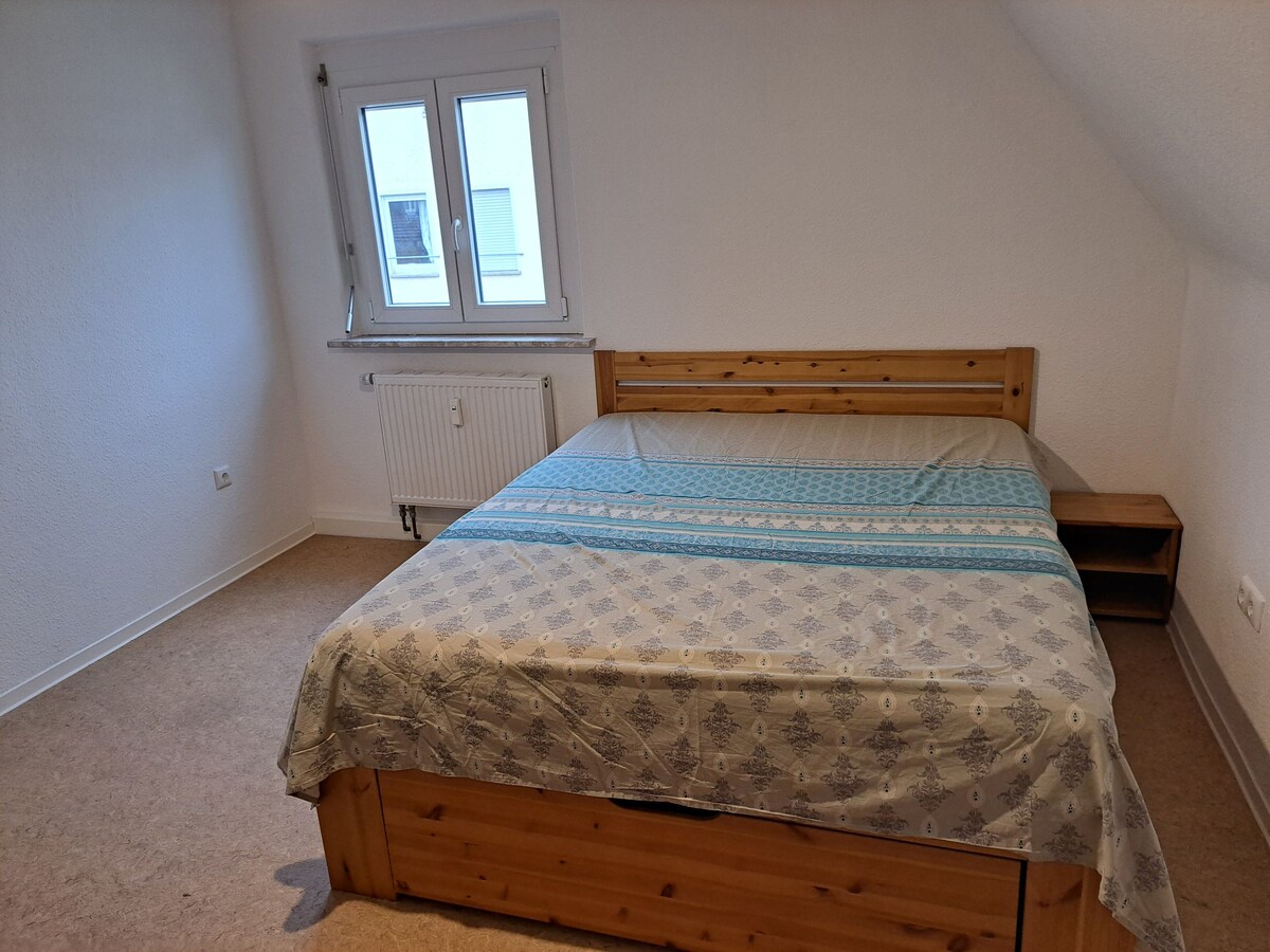 It´s a light room with a single bed, a desk and a wardrobe, shelves and dressers. Just for non-smokers! The washing machine and the dryer are in the bathroom. The fair of Friedrichshafen is about 9 minutes by car. There is a parking place in our street. The lake of Constance you can reach by car in about 10 minutes.