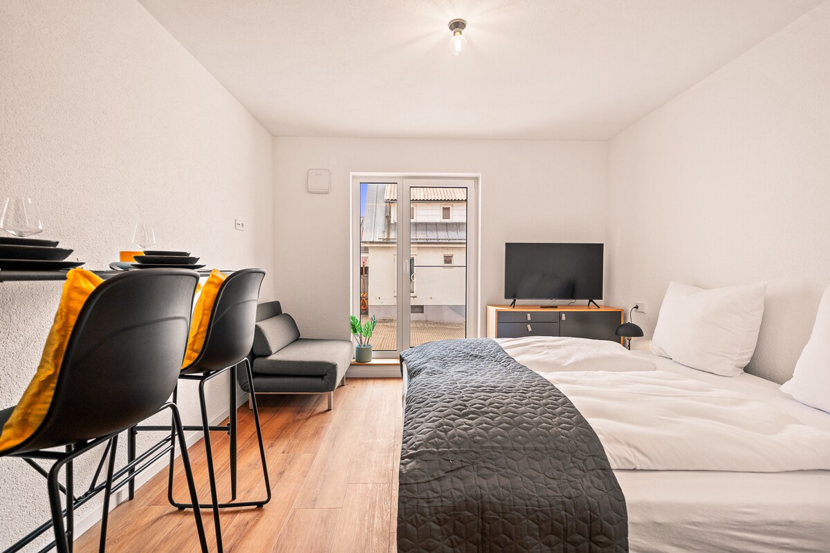 Only 5 minutes walk from the lake you will find our bright, absolutely stylish apartment in Friedrichshafen - Fischbach. Fischbach is a suburb of Friedrichshafen and only 6 km from the city center. Live on 59 square meters in 2 rooms. The light-filled living room with dining area and sofa bed invites you to linger. Wi-Fi is also available.