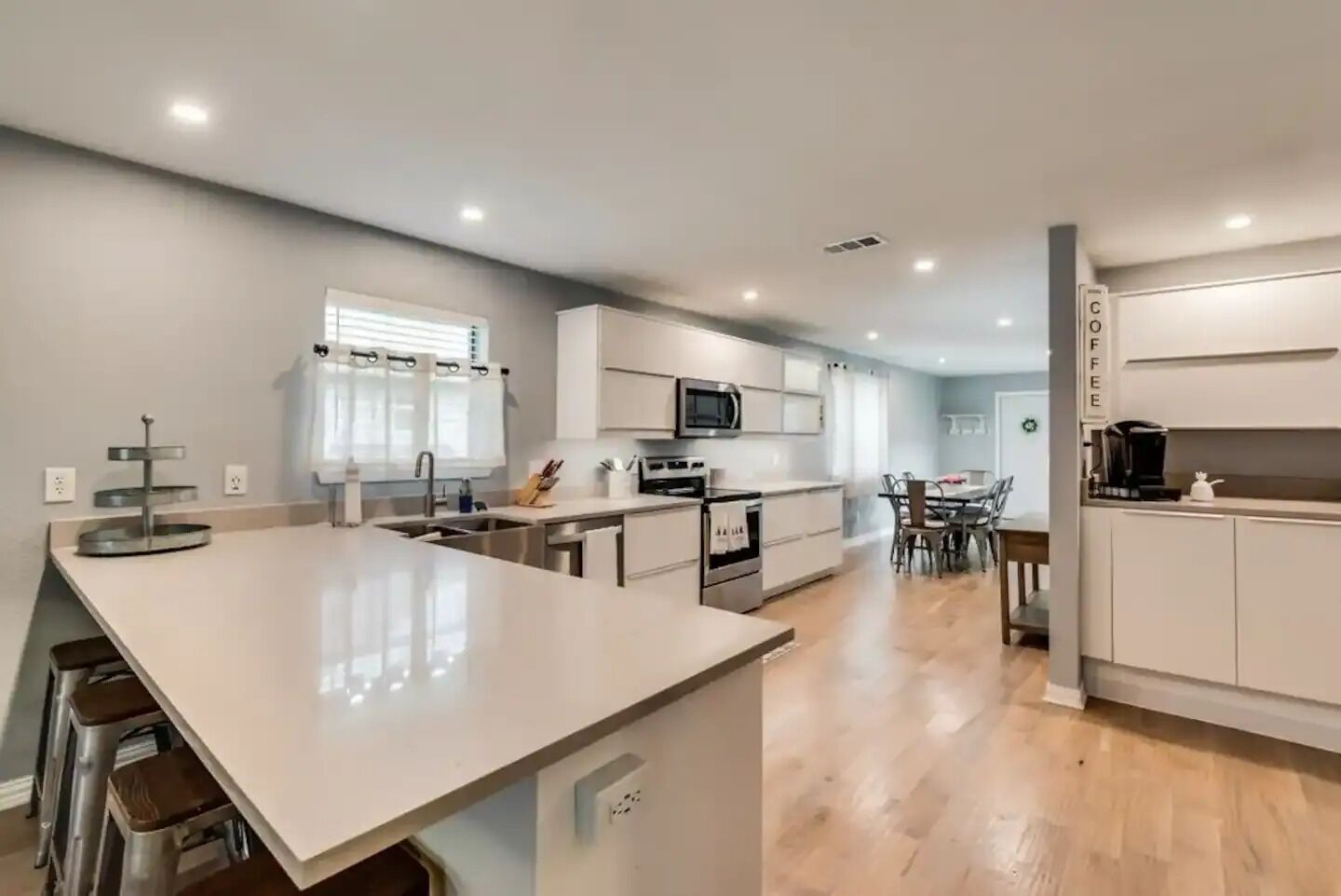 This 2400 SQFT high ceiling home has 6 bedrooms (the master & 5 guest rooms) and No Carpet.