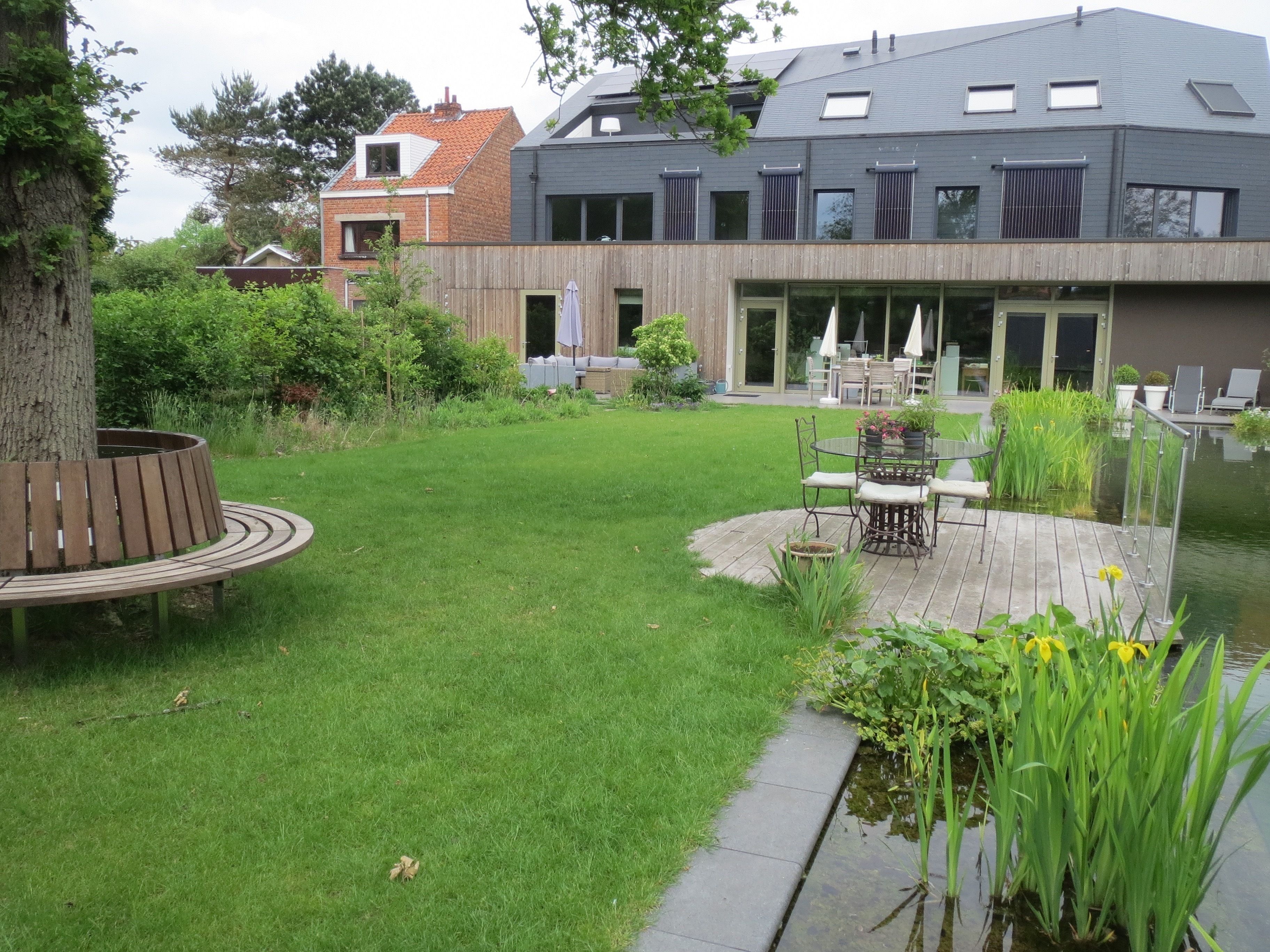 There is a sunny garden with sunny terrace, kamado bbq, lounge seats and trampoline.
