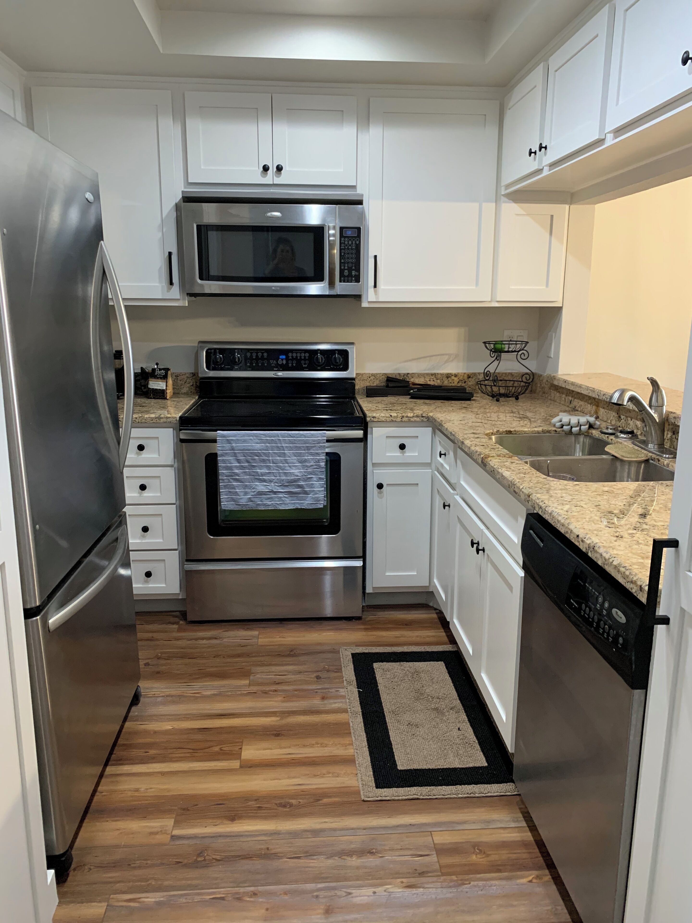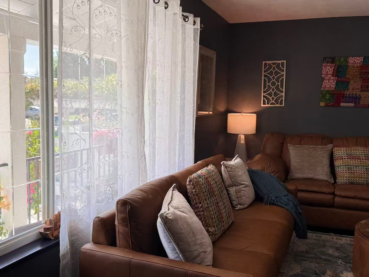 Hardwood floors and ample natural light highlight the interior space as you enter the guest house! Sumptuous leather furnishings beckon you to relax after a long day of traveling. Catch up with your favorite shows on the flat-screen TV or catch up with friends and family.