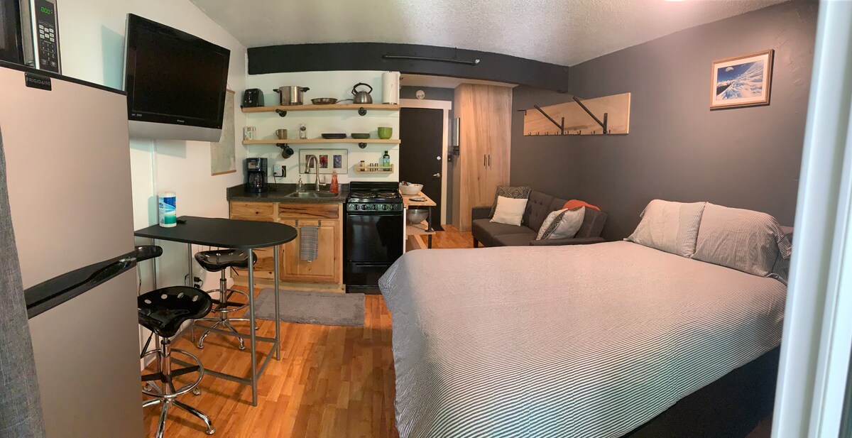 This brand new unit is perfect for the adventurer looking to spend as little time indoors as possible. This unit is equipped with one bed, one bath, and a kitchenette that includes a not so mini mini-fridge, microwave, toaster oven/air fryer combo, induction cooktop, with your basic cooking essentials, and stainless steel utility sink.