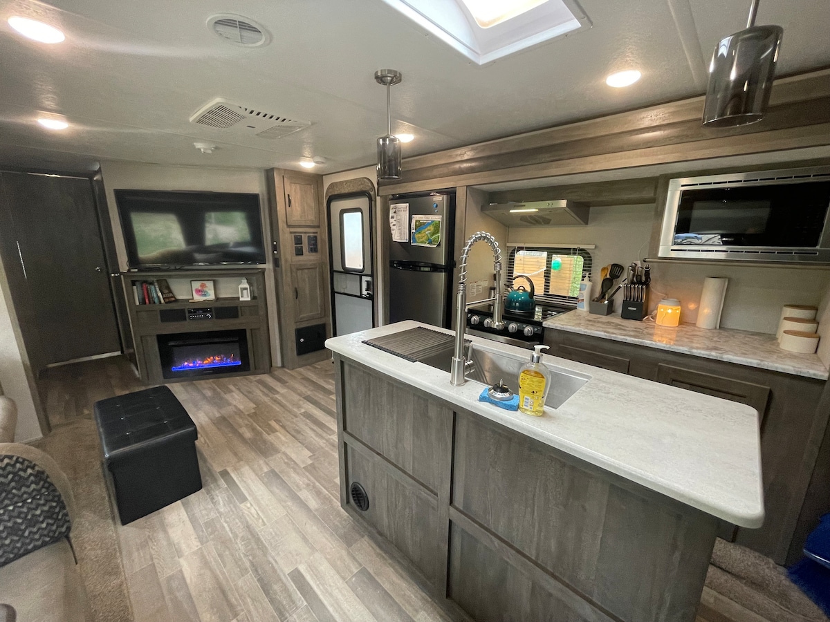 Island in kitchen and skylight, with stainless steel appliances. Has booth style seating. Table also converts to bed. Spacious bunkhouse trailer with 3 large slides and an awning. Checked and sealed annually.