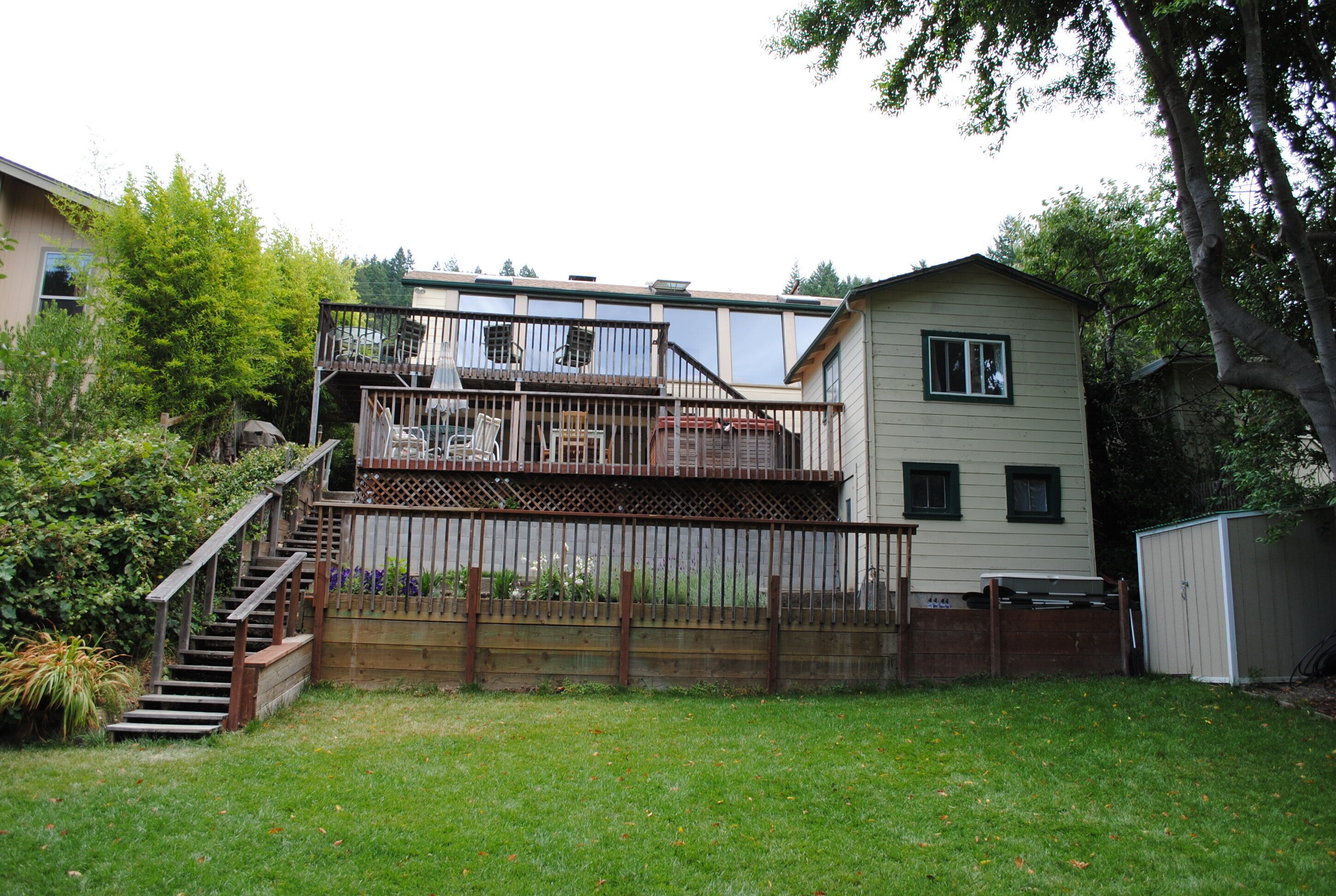 Just off the deck, the backstairs lead down to a large grassy, fenced backyard with a horseshoe pit, and plenty of room to play amongst beds of beautiful flowers, roses, and banana trees. We have lots of fruit trees, cherry, plum, 2 apples, pears you are welcome to enjoy when in season. There is also an outdoor shower with hot and cold water to rinse off after the river, or just enjoy taking a shower outside under the stars. Situated under the canopy of an apple tree, is the Boat House which is the perfect place to take a nap on the futon, or change clothes after coming up from the river. The Boat house also has lifejackets, paddles for the kayaks, and other toys to play in the River or the yard with.