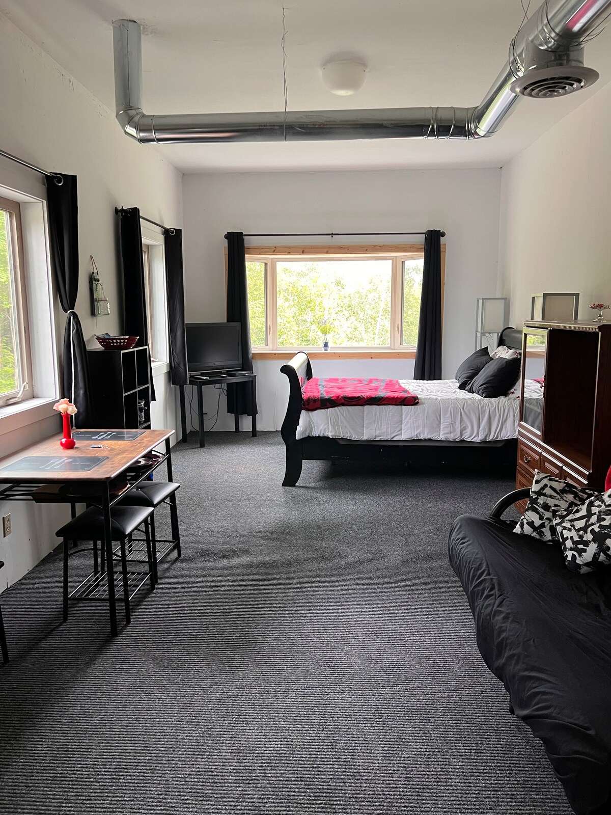 Apartment #2 has one bedroom with a queen bed and a low-ceiling sleeping loft in the bedroom that is accessed by a ladder. Not suitable for small children or those with mobility issues. The loft has two fold-out floor mattresses.