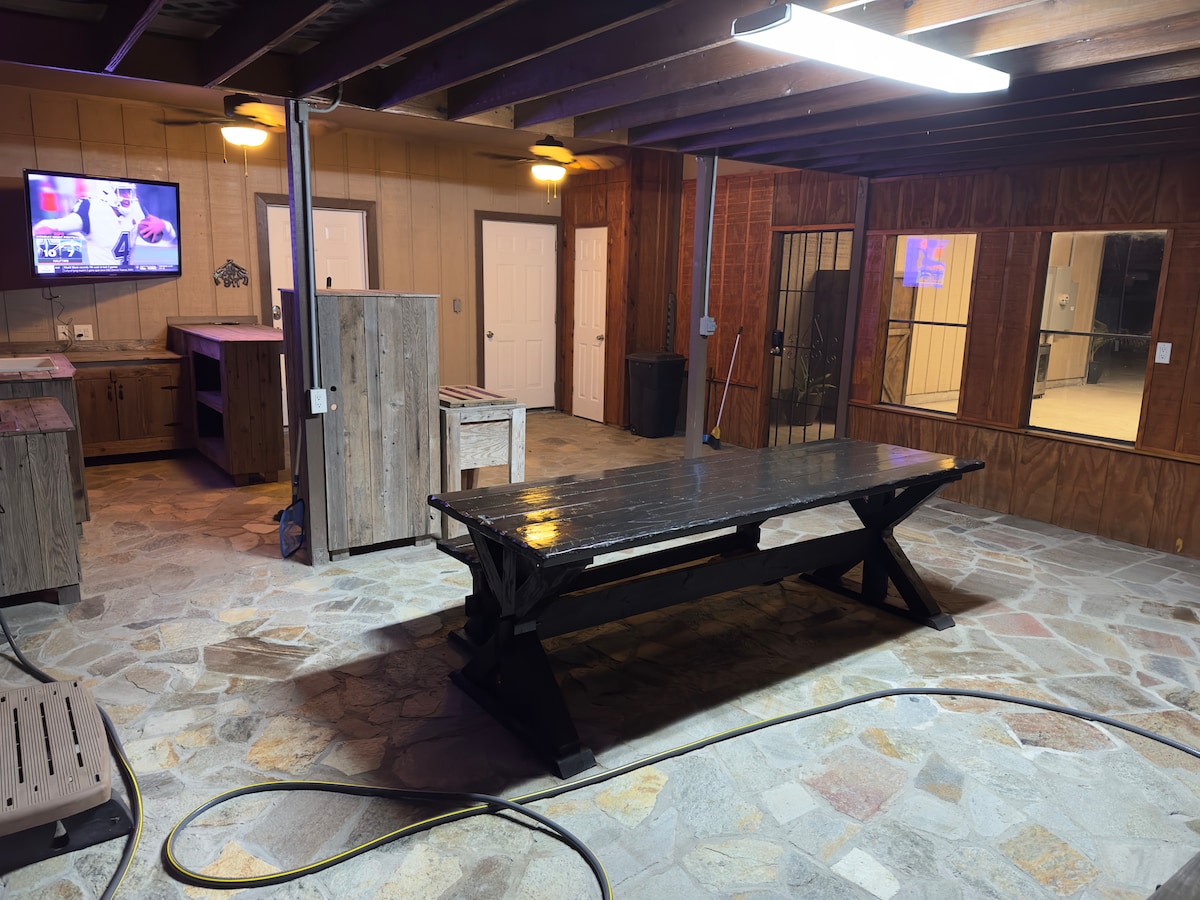 INDOOR LIVING: 3 flat-screen cable TVs, modern decor, plush furnishings, pool table, foosball table, shuffleboard, wet bar, dining table