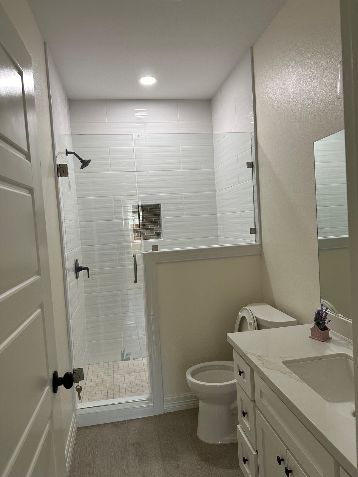 BEDROOM 1: Queen bed with attached full bathroom, including a shower.