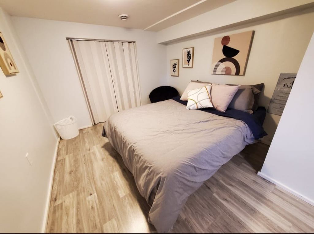 Our peaceful Airbnb basement features three comfortable bedrooms: a luxurious king-size bed,cozy queen-size bed, and two snug single beds. Each space is thoughtfully designed to ensure a restful stay.