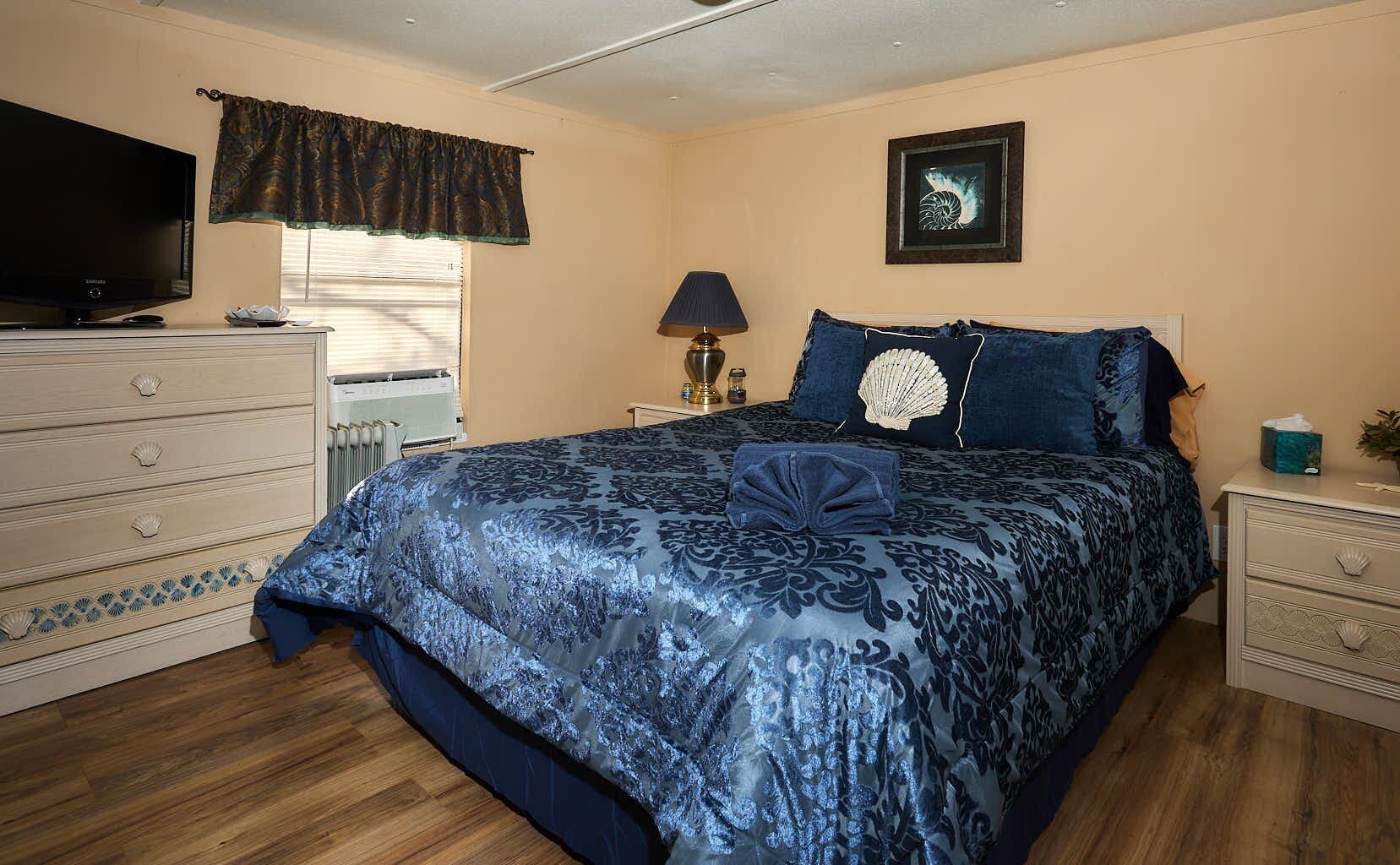 This delightful rental features two bedrooms. The "guest" room has one queen bed with a brand new high quality mattress. The "master" bedroom has a brand new, very comfy king size bed, as well an additional 2 twin beds for kids or grandkids in the attached sleeping area. *Please note, access to the twin beds is only through the master bedroom. It is not a seperate third bedroom, but instead it is a room attached to the master bedroom. (Please see floor plan in photos for details) Both the master and the guest bedroom feature a smart TV. There are two bathrooms (both featuring walk in showers), making it an ideal choice for up to six guests. Each room is thoughtfully designed to provide a comfortable and relaxing atmosphere, ensuring a peaceful night's sleep after a day of exploration.