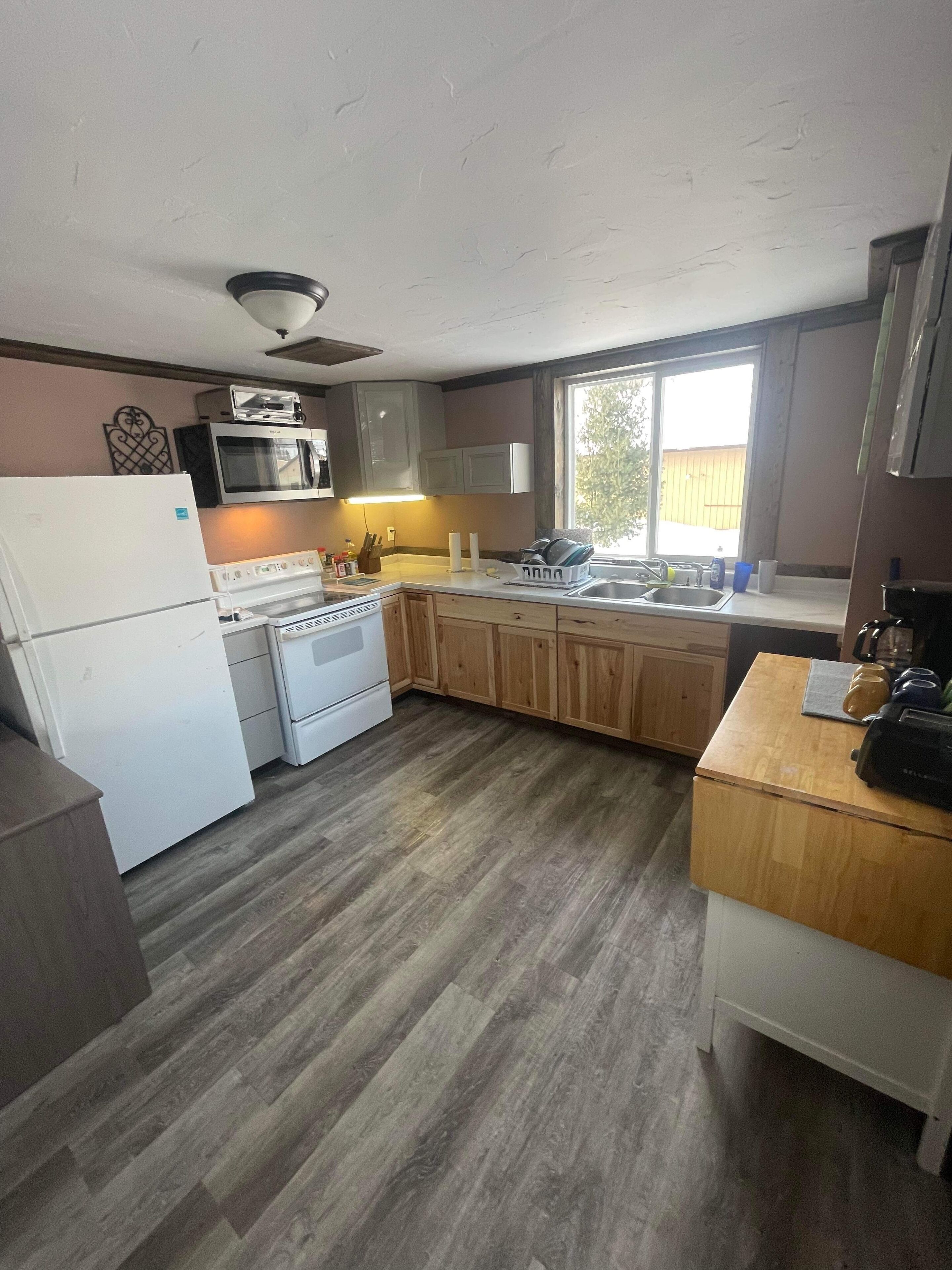 A full kitchen with a large island to accommodate all your basic needs including: a Keurig, pots, pans, cutting board, dishes, utensils, paper towel, microwave, oven, and refrigerator. Bathroom is fully stocked with essentials and bath towels, wash cloths, shampoo and conditioner, and a hair dryer.