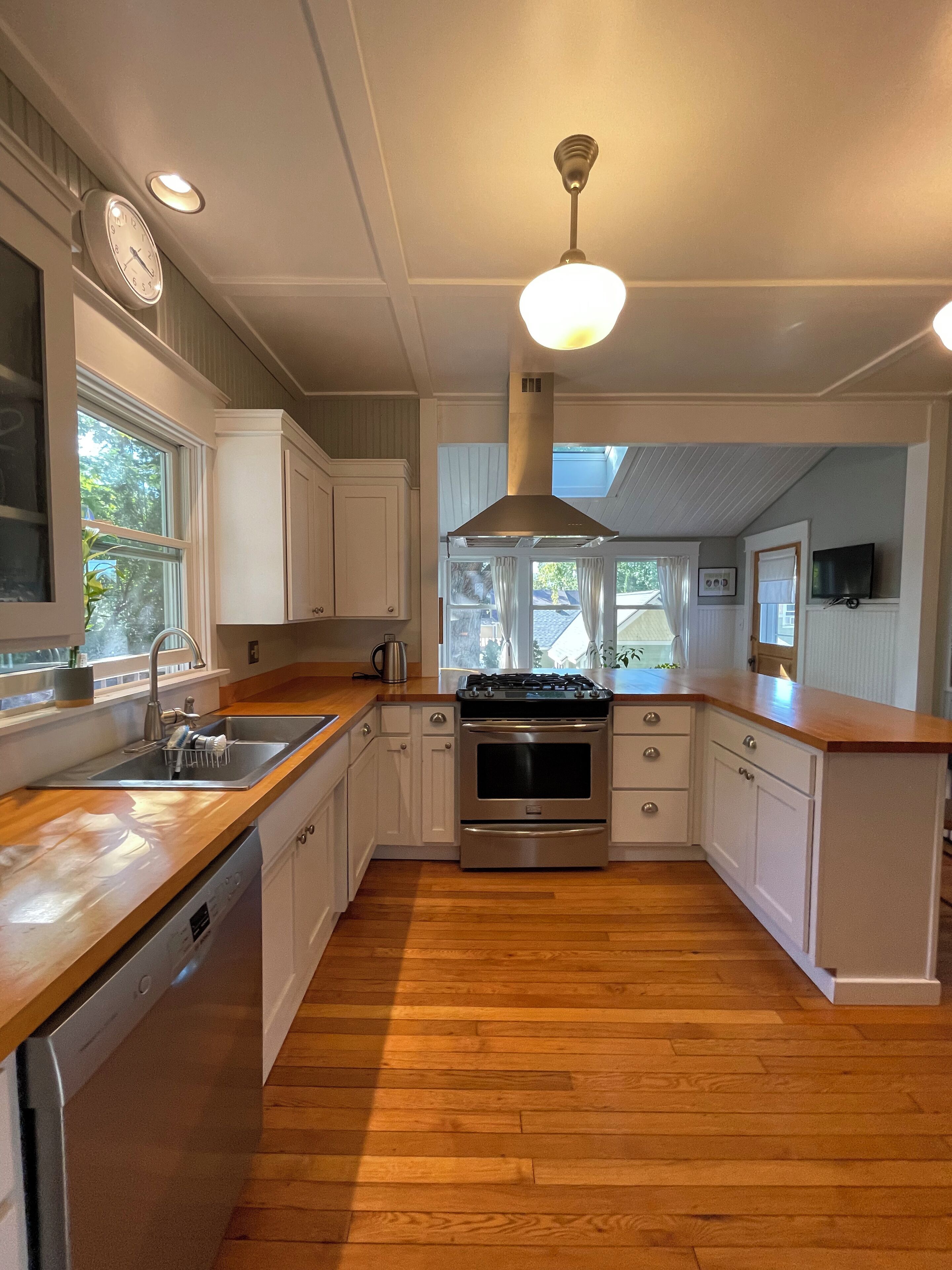 Comfortable new beds (1 king, 2 queens), wifi throughout the home, printer/scanner available, charming 3 season porch, fully stocked kitchen with fresh ground coffee included. Large high-definition televisions in the living room and both bedrooms. This home also boasts an outdoor combo gas/charcoal grill, fire pit, and patio furniture. Guest have access to a washer and dryer as well as a garage spot (upon request).