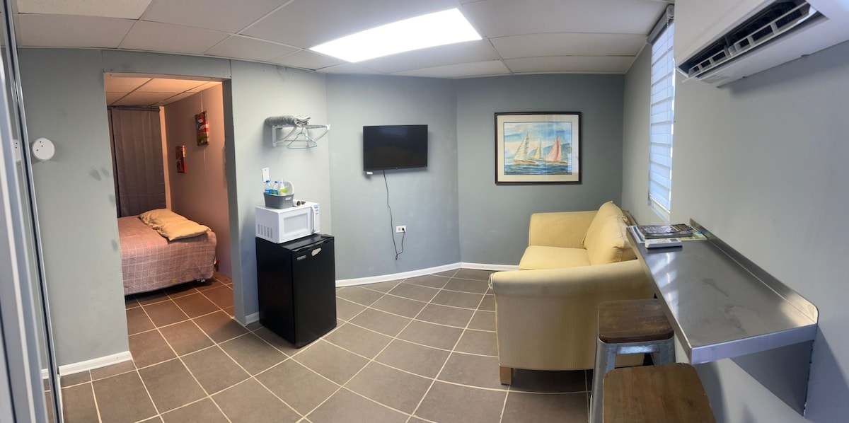 Vista Mar Studio that accommodate TWO Guests (ADULTS ONLY). The studio is equipped with a Queen Side Bed, AC, Small Private Bathroom, Small Living Room with TV (Roku digital media), Small Refrigerator, Coffee Maker, Microwave Oven, Toaster, Essential Utensil and Mini Balcony.