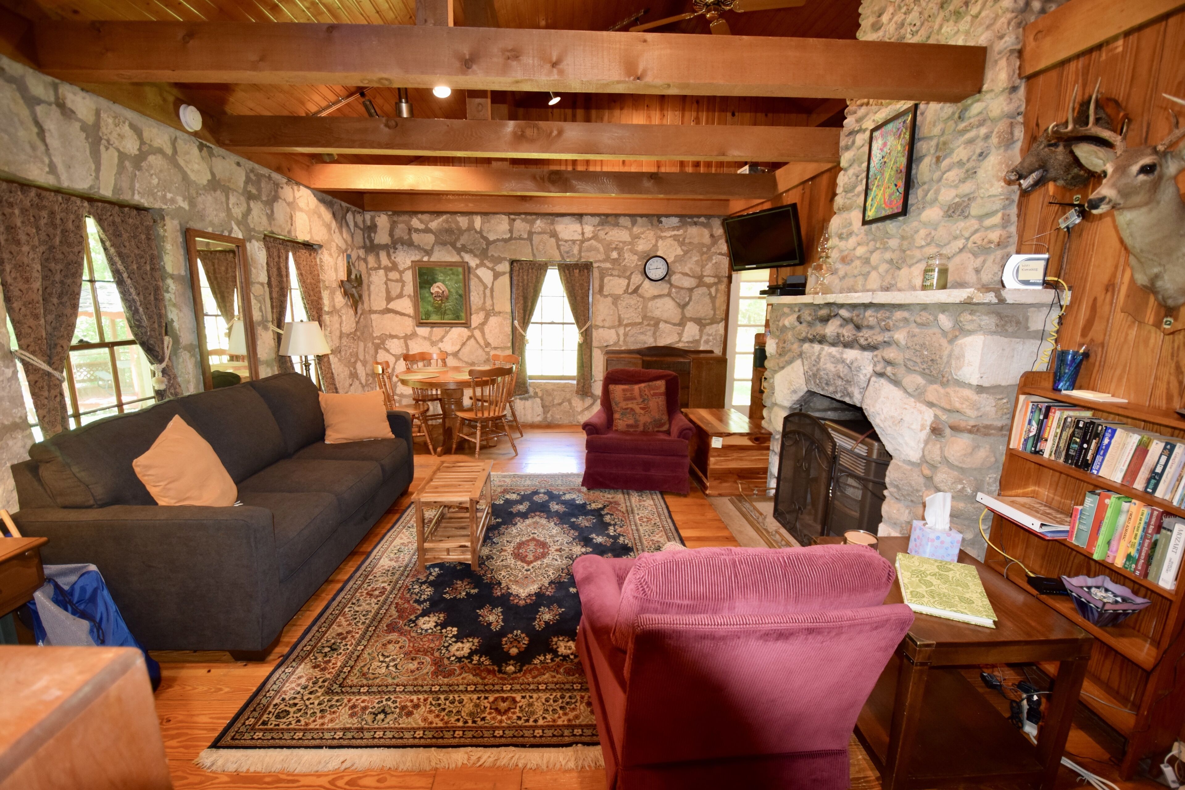 The Main House living area is spacious, rock fireplace, TV, 2 dining rooms, and wet bar/game area, wrap around front porch, cantina, BBQ, and fire-pits. 7 bedrooms and 6.5 bathrooms. The Sunday House is an 1800s-style cabin adjacent to the Main House with 4 beds and a bathroom. 1350-ft of riverfront, spring-fed sitting pools.