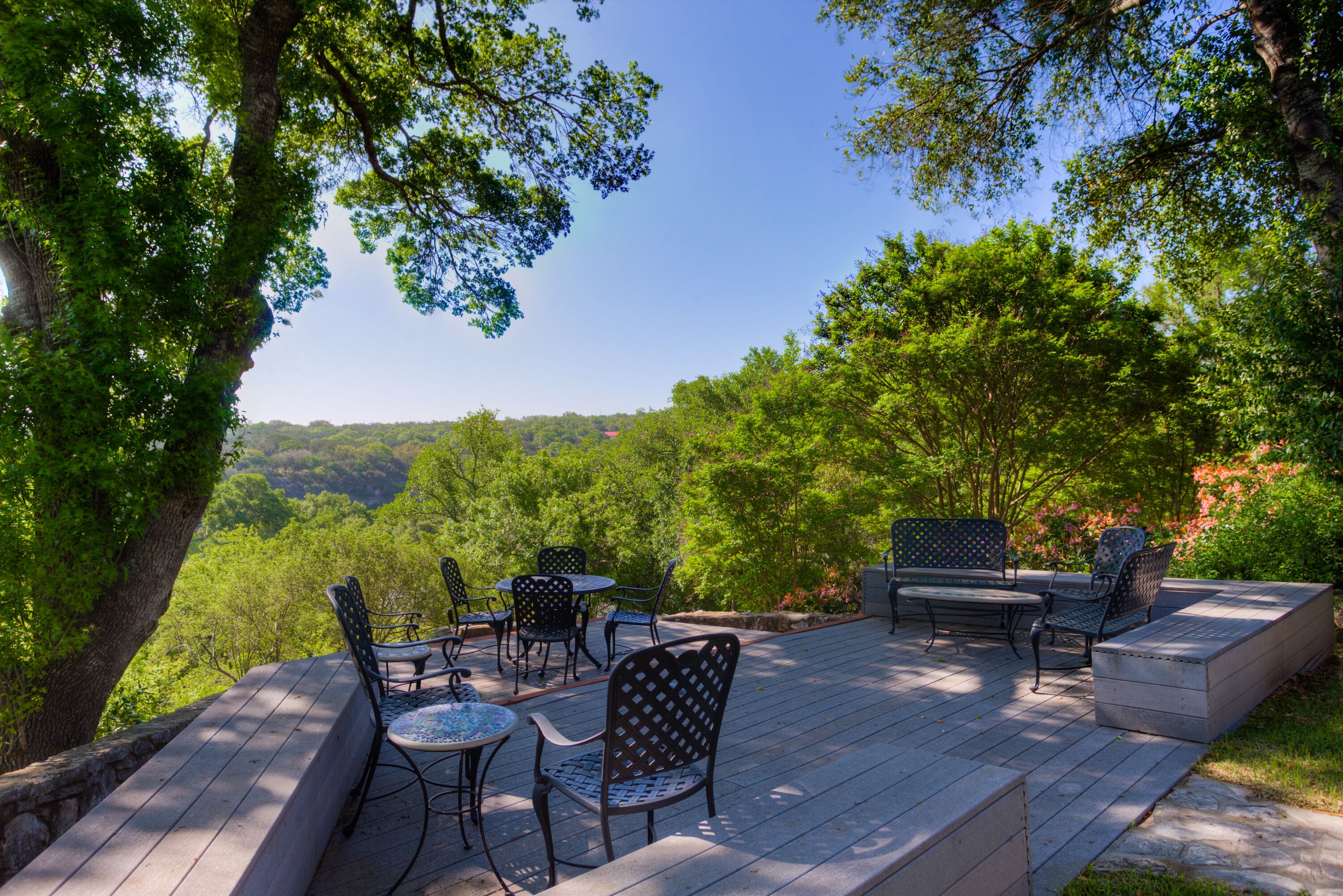 A spacious private outdoor area overlooks the river, and includes a table with 6 chairs, 2 lounge chairs, 2 rocking chair swings hanging from a stately old Chinkapin Oak tree, and a large rock fire pit for roasting marshmallows and enjoying a warm evening fire. Enjoy all this while listening to the timeless sound of the river flowing amid the rocks and sprawling Cypress trees. Abundant wildlife, featuring Whitetail and Axis deer adding to your enjoyment while staying at Casa del Rio Riverhouse, your Hill Country retreat.