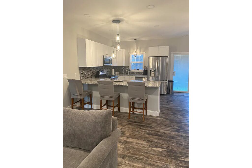 On the first floor, The Cozy Cape offers 2 well appointed bedrooms; one featuring a queen size bed and the other featuring a full size bed. The spacious living room is highlighted by a large wood burning fireplace where guests can cozy up on those chilly evenings. Our kitchen has all the best amenities including stainless steel appliances, a Keurig coffee machine, and quartz countertops. The kitchen is fully stocked and appointed with all culinary equipment, glassware, and dishware to allow one’s inner Gordon Ramsey to shine. Additionally, Guests can escape to two bedrooms upstairs with one offering a full size bed with office area and en-suite half bathroom, and the other bedroom offering 2 twin XL beds with a reading nook.