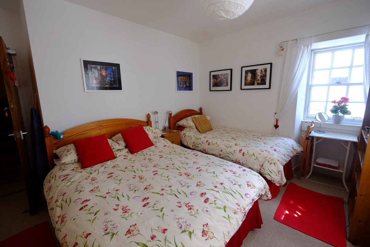 The flat is on the first floor, accessed via stone steps to the rear of the building. Once inside, there is a large living room with open plan kitchen off the top corner separated by a breakfast bar. There is a family bathroom (electric shower over the bath), a twin room, and a master double bedroom with enough space for a travel cot (not provided - please bring your own). Freshly refurbished in 2021, the flat provides a comfortable, modern space for you to enjoy the area and the proximity to facilities.