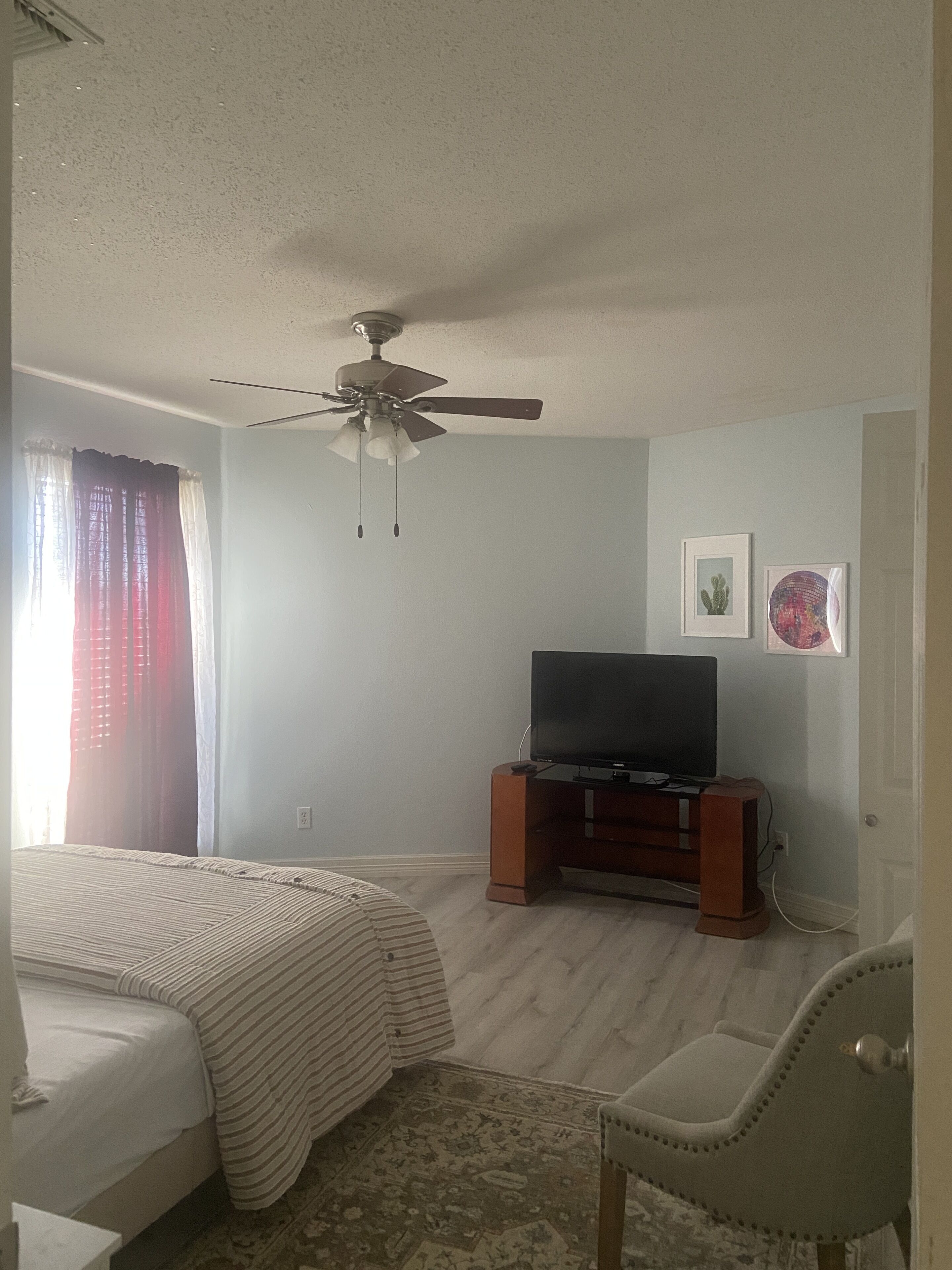 Bedroom includes Tuft & Needle full size mattress, ceiling fan, closet, dresser, blackout curtains, pocket door without lock, and 42” streaming tv.