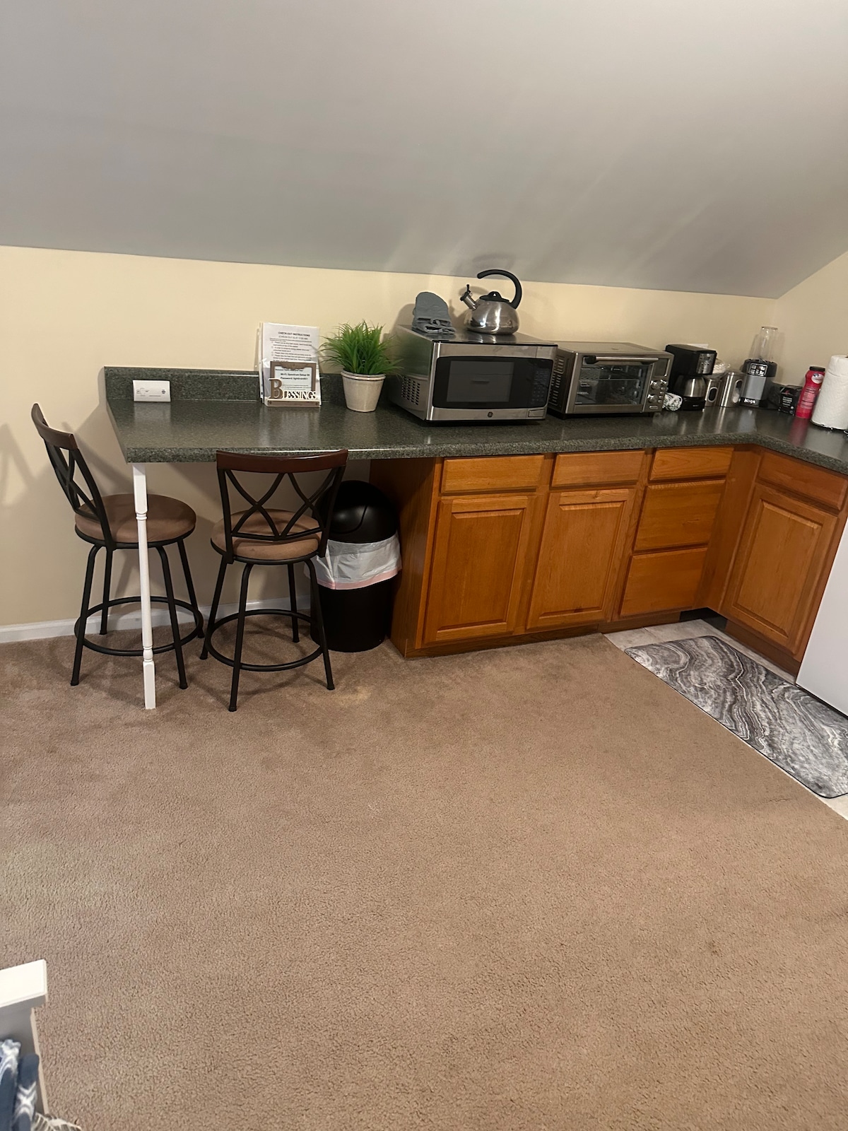 Kitchen is fully stocked with dishes, pots, pans and baking sheets for your use. There is also a dedicated kitchen cabinet and use of second kitchen refrigerator.