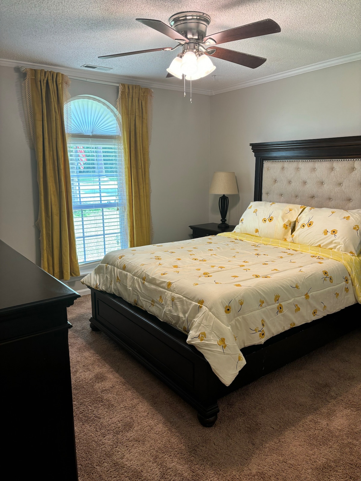 Private room with Twin XL bed, Blackout curtains, end table, dresser, ceiling fan, TV with lounge chair and work space. Shared bathroom with occasional guests