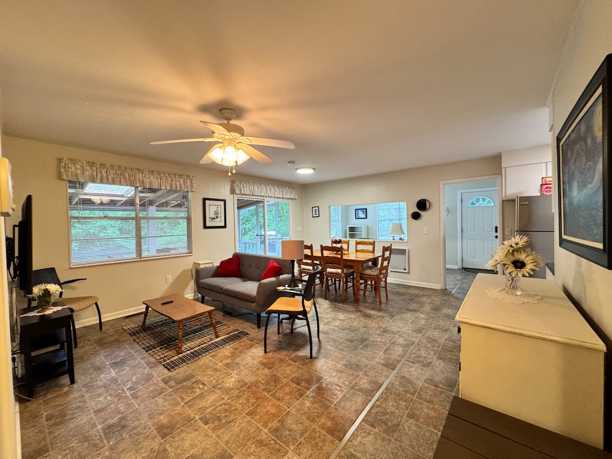 Spend your mornings sipping coffee on the screened-in porch, your afternoons paddling in the free kayaks, and your evenings stargazing by the river. Whether you're looking to fish, float, hike, or just breathe some fresh Tennessee mountain air, this spot makes it easy to relax and recharge.