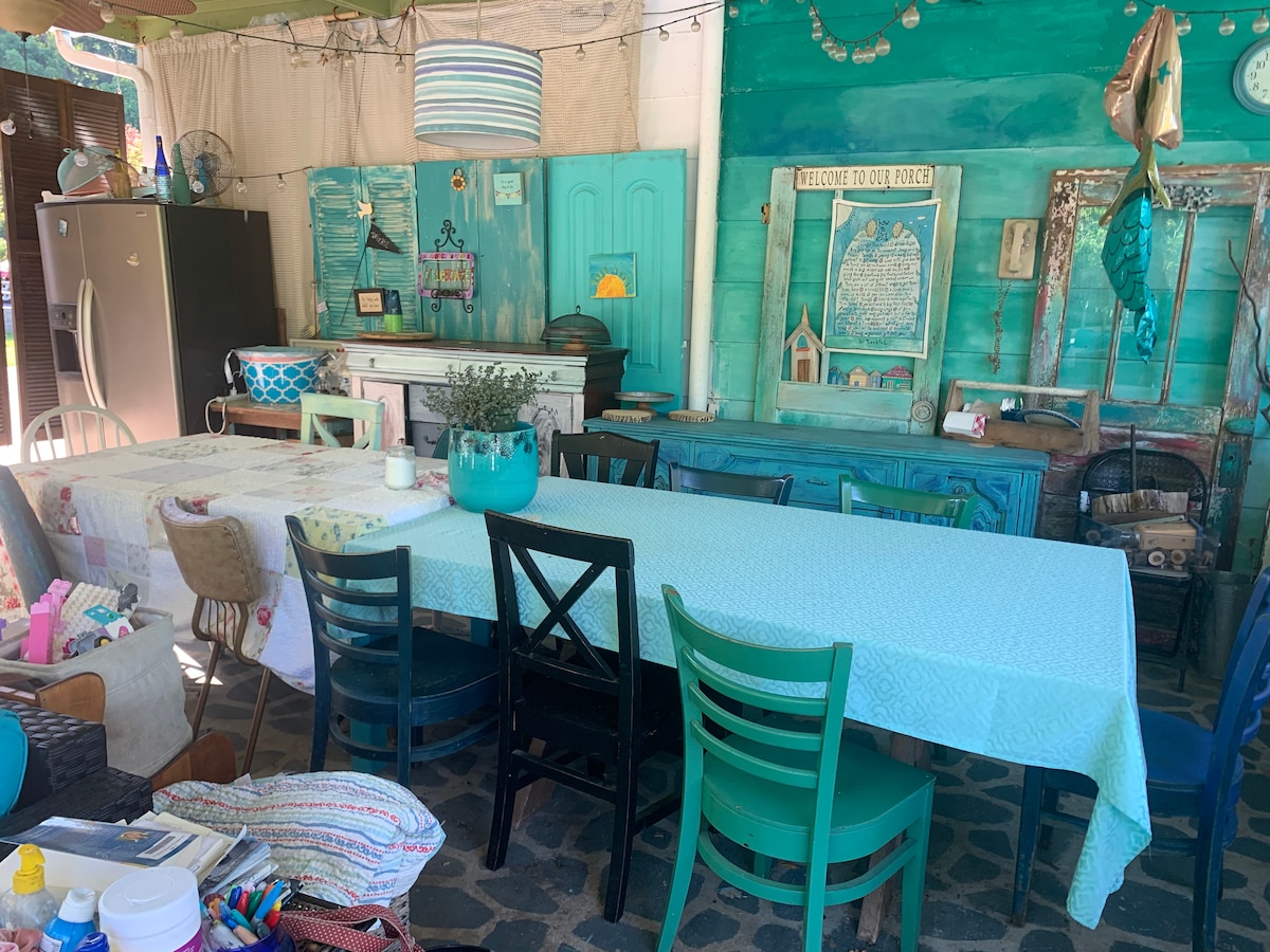 Amenities include:outdoor pool and patio, Amazon stick for TV, hair dryer, small refrigerator, coffee maker, microwave. Iron and ironing board,pack and play, inflatable mattress and gift voucher to Johnson City's #1 voted coffeehouse (Open Doors) owned by the hosts.