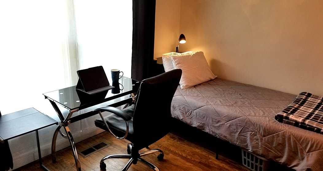2. You have access to the whole house and your bedroom is conveniently equipped with a workspace complete with a desk and chair, armchair and ottoman, bookshelves, reading lamps, ceiling fan, filtered floor fan, and plenty of outlets including a surge protector.