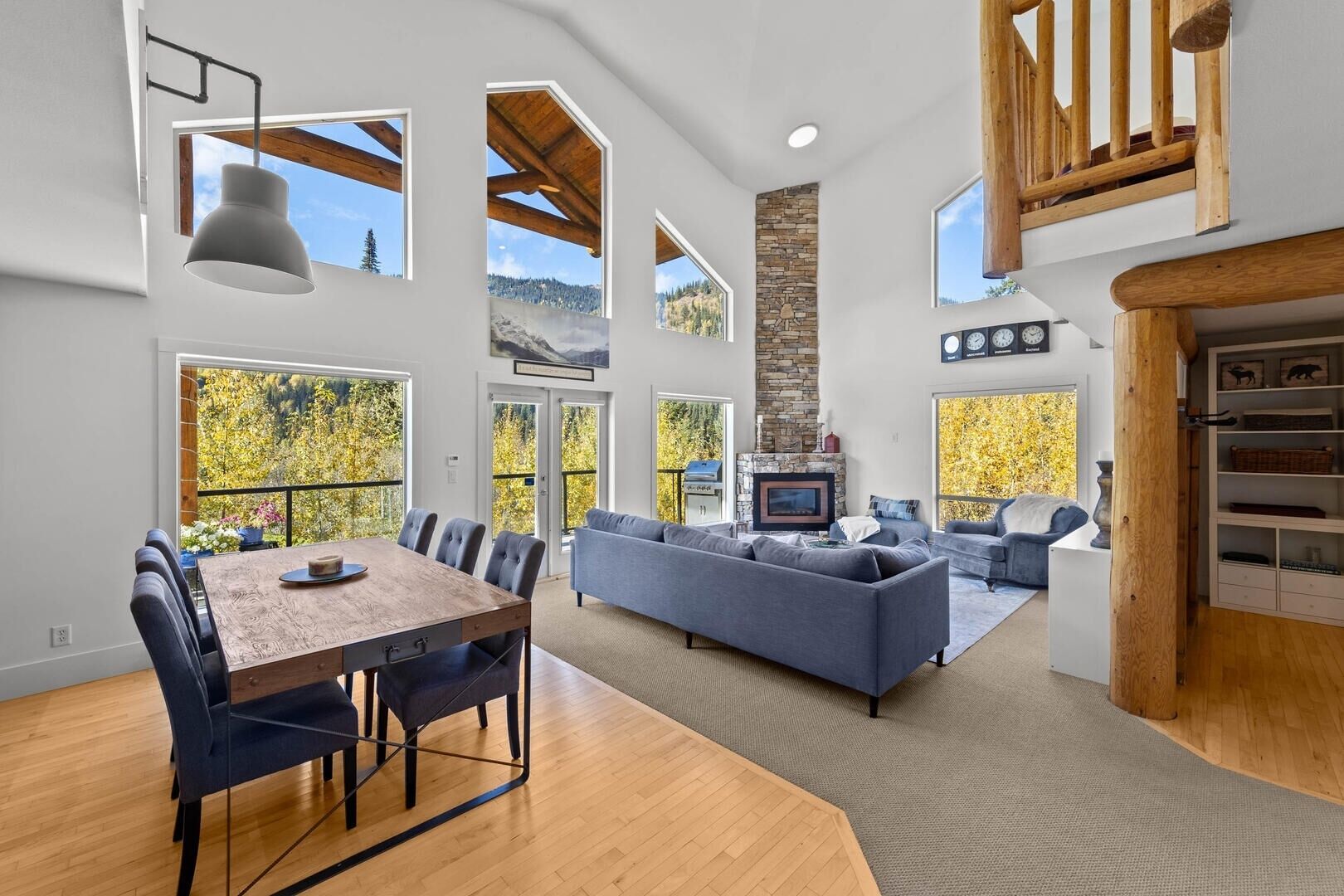 Entry level includes in-unit washer and dryer and a den with a Smart TV and 2-sets of twin bunks (4 beds). Second level has a walk-out to front deck with beautiful mountain views and a back porch with a bbq and hot tub. Warm and welcoming, this floor features a 2-piece bathroom, fully equipped kitchen , dining area and great room with a flat screen TV, gas fireplace and pull-out couch. The third floor has 2 bedrooms, one with a queen bed and ensuite. The second bedroom has a twin over queen bunk bed. Both rooms have televisions, dressers and clothes closets. There is a second full bathroom on this level. Bathrooms, kitchen, and entrance all feature heated tile floors and beautiful fir cabinets and doors.