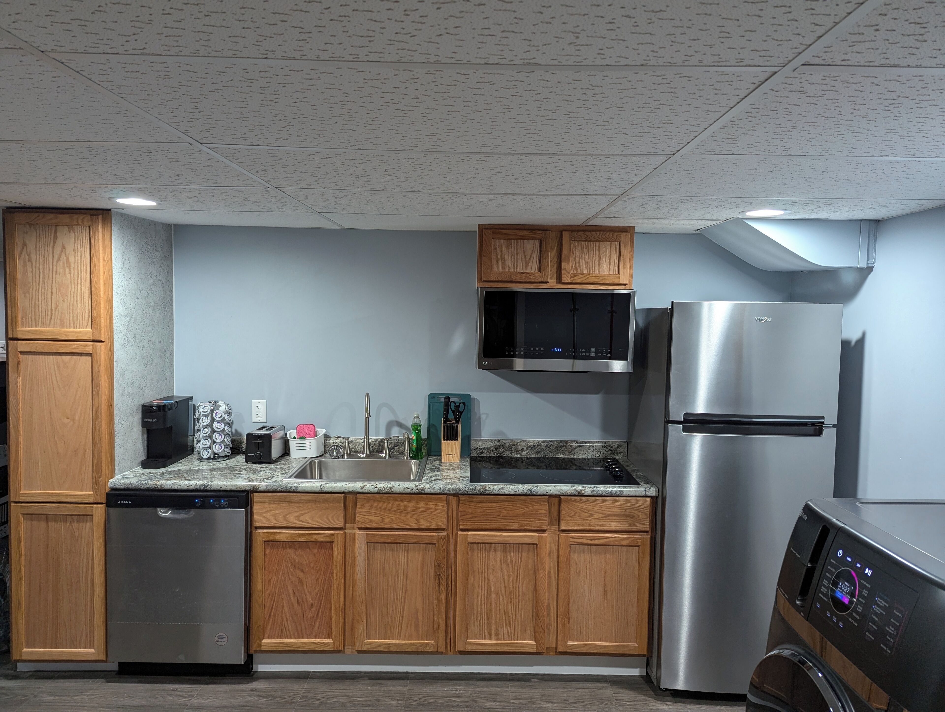 This stylish place to stay is perfect for quick trips or long term stays. It has a separate entrance and the air b & b is the whole basement. Has one large master with king size plush bed connecting bathroom with shower. Second bedroom has two twins beds and there is an exercise room, large living room with flat screens in all rooms. Wifi, Hulu, and Netflix access. Half bar with coffee maker, fridge, and table oven. Lounge areas. Long term stays have access to kitchen, washer/dryer.