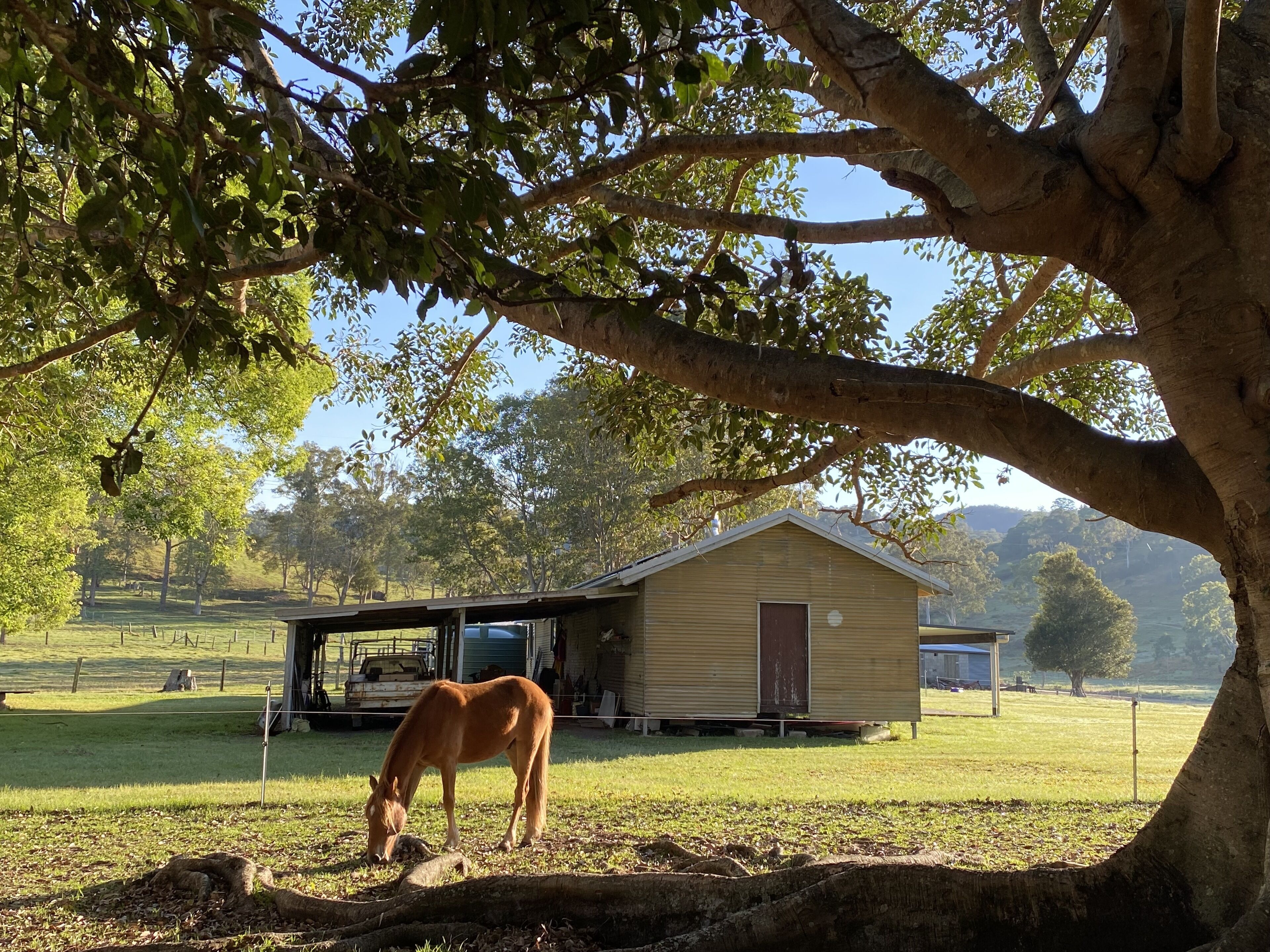 We have approximately 30 acres of paddocks & bush available for you and your off leash pets to explore including access to "The Bluff" for the more adventurous. It's been rumored that Greg Postle used to camp here seeking solitude and subjects for his famous paintings as a resident of Kenilworth. A short marked track commencing from the back of the studio takes you into some of the last remaining privately owned original rain forest in this area containing massive buttress fig trees.