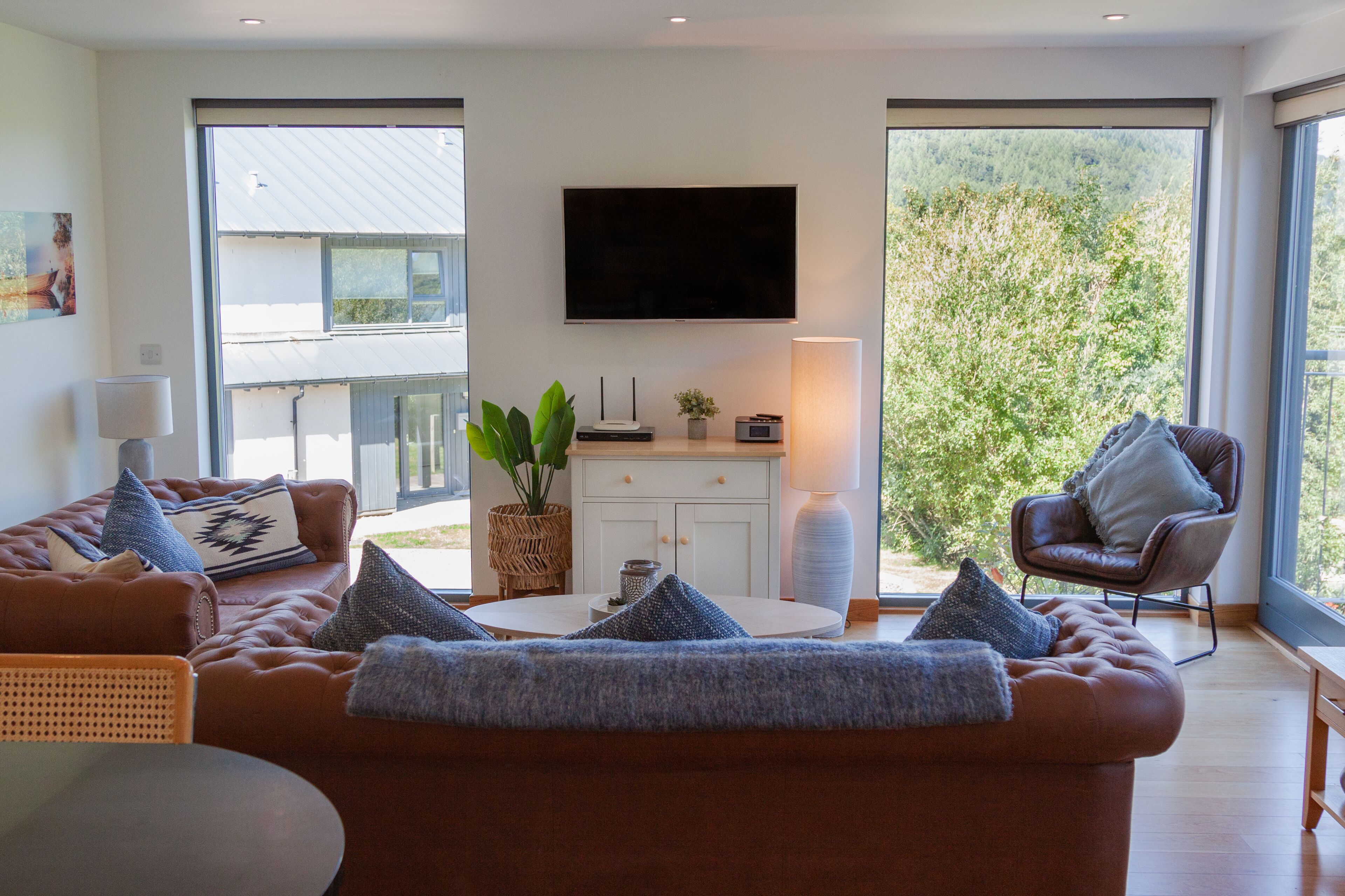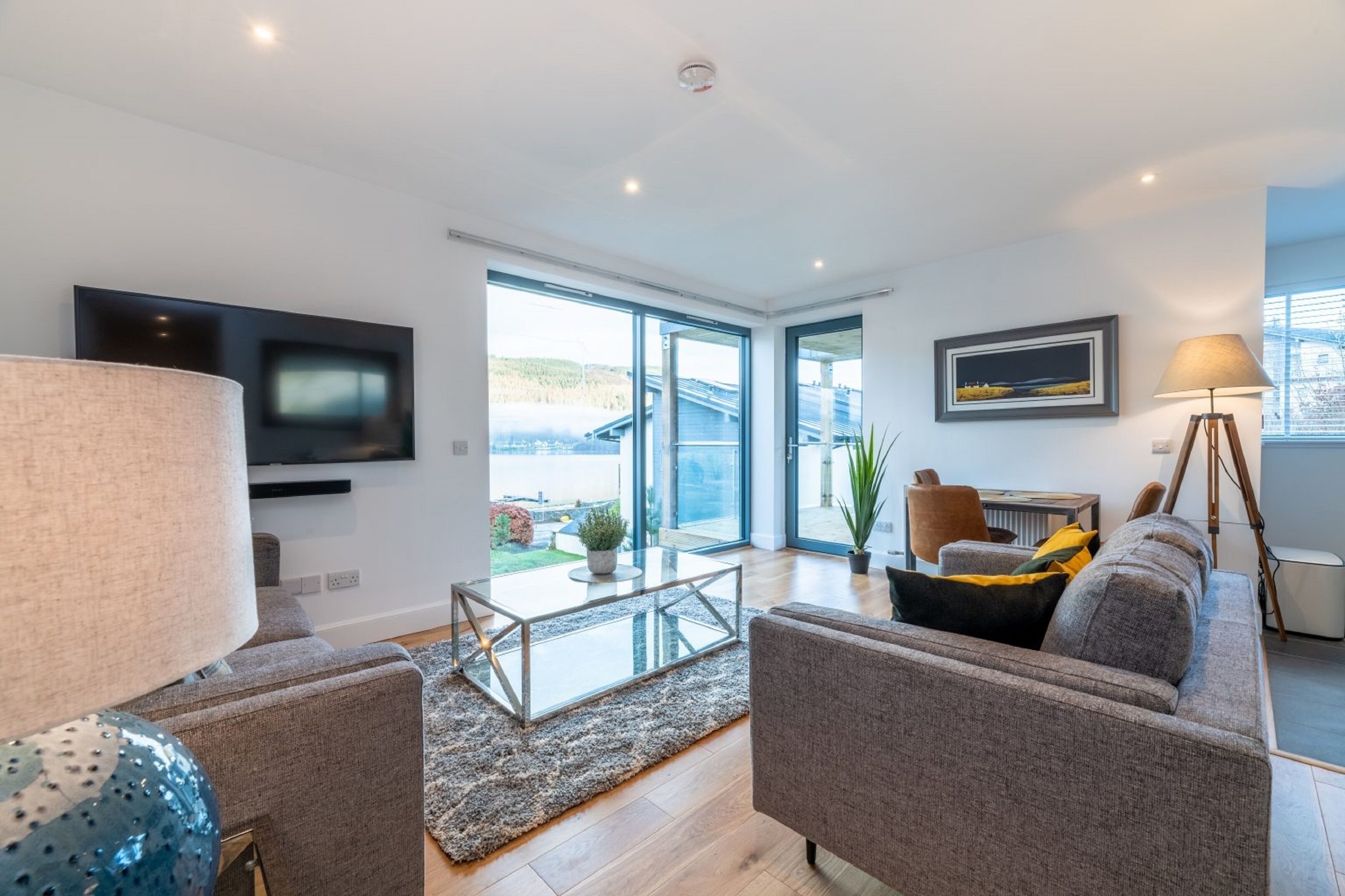 The spacious living room with wonderful views out to the loch and river comfortably seats 8 and has a newly installed woodfired log burner. Patio doors lead onto the outside seating area for alfresco dining. A separate snug room with sofa (can also double up as an office or playroom) has a TV and a selection of books and board games offering maximum flexibility.