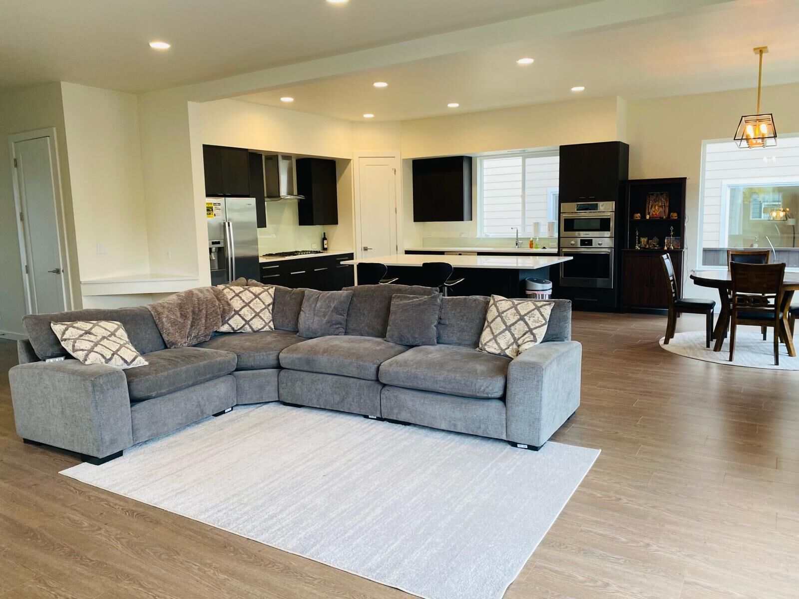 Walk in pantry, large, well supplied kitchen. Nicely furnished dinning and living rooms. New TV with video game options. Laundry room and large garage. New carpet upstairs, hardwoods downstairs. New paint throughout, ceiling fans with dimming light.