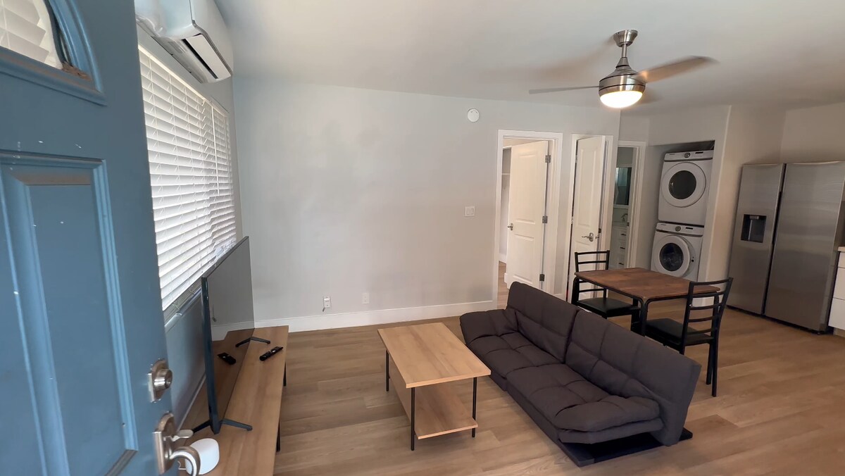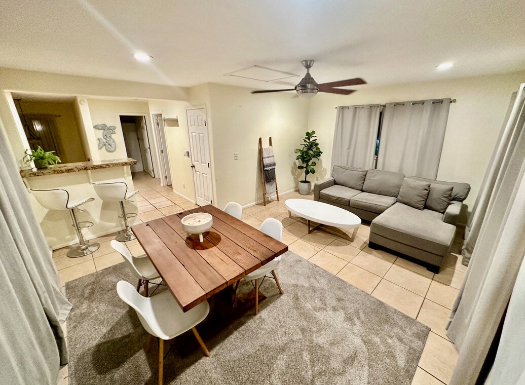 Common area: We have an open floor plan consisting of a full kitchen and breakfast bar(2 stools), New Smart TV with cable, Queen sofa sleeper with linens, window AC system, ceiling fan, dining table, and sitting chairs. In unit washer/dryer. Beautifully remodeled kitchen with quartz countertops and upgraded stainless appliances.