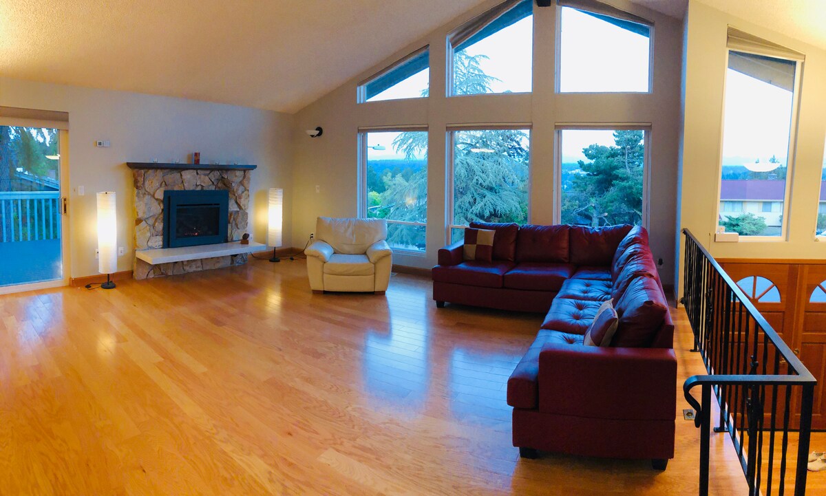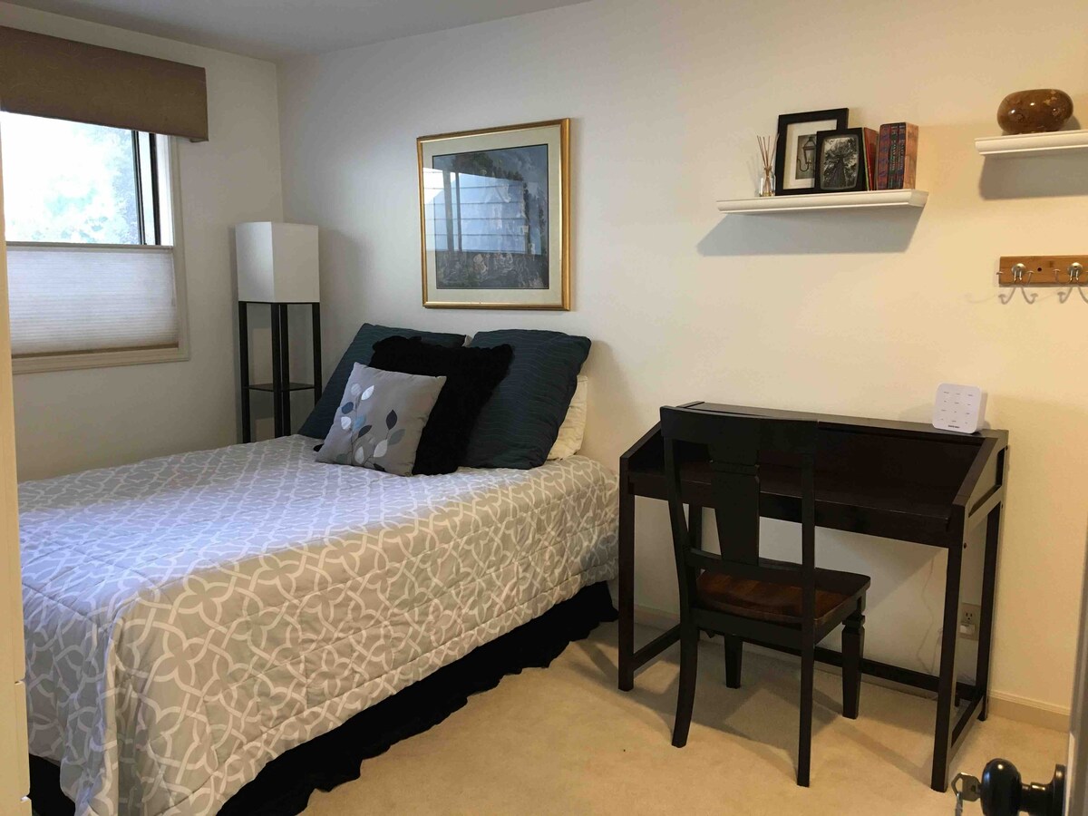 Clean, warm, comfortable and safe private bedroom with ample shared common areas in this large, two floors, 3,000 ft2 recently renovated house, minutes away from the nicest spots in Kirkland, WA, is equipped with a queen-size bed, desk, chair, lamp, shelf and hangers in the closet and a 40" TV Set with ChromeCast for streaming. Living room has a shared fireplace.