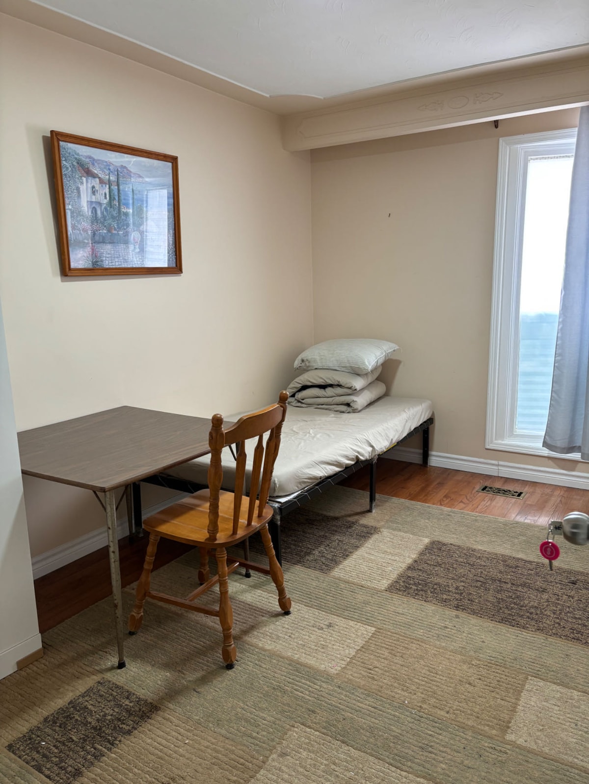 This is nice and soothing room with a view to the quiet street, same level as the kitchen and washroom. Has wood laminate flooring and a small desk. The window is sealed in the winter so there are no drafts, functional during the warmer spring and fall days. We have air-conditioner in other windows so during the summer we keep the windows closed and the cool air spreads all throughout the house.