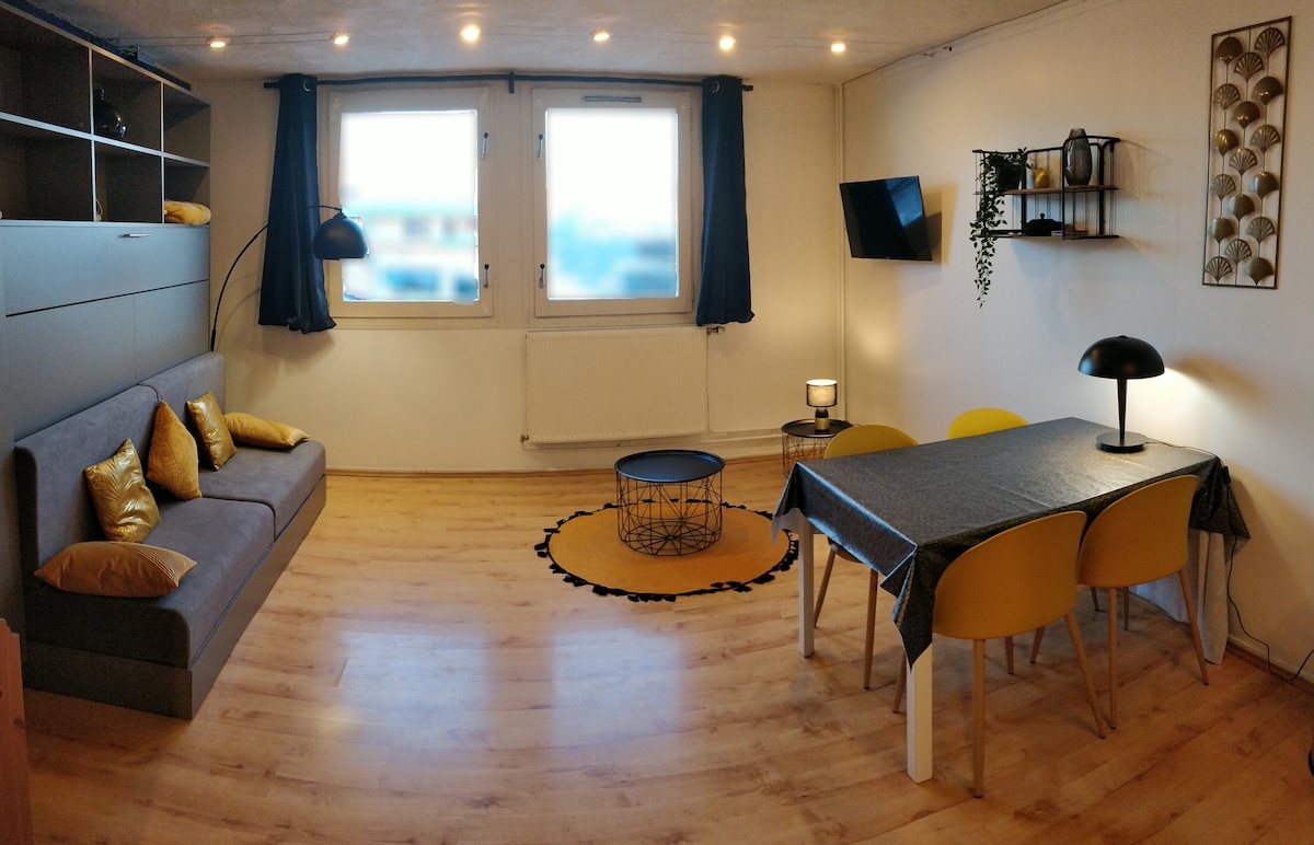 The living room is illuminated by a large picture window and includes a very comfortable Rapido type sofa (ultra-simple mechanism) with a bed of 160 cm. A duvet holder is located behind the sofa which allows the sofa to be folded up quickly and daily. The flat screen TV (108 cm) is connected to WIFI and a Blu-ray player. You can listen to your music through a BOSE Bluetooth speaker.