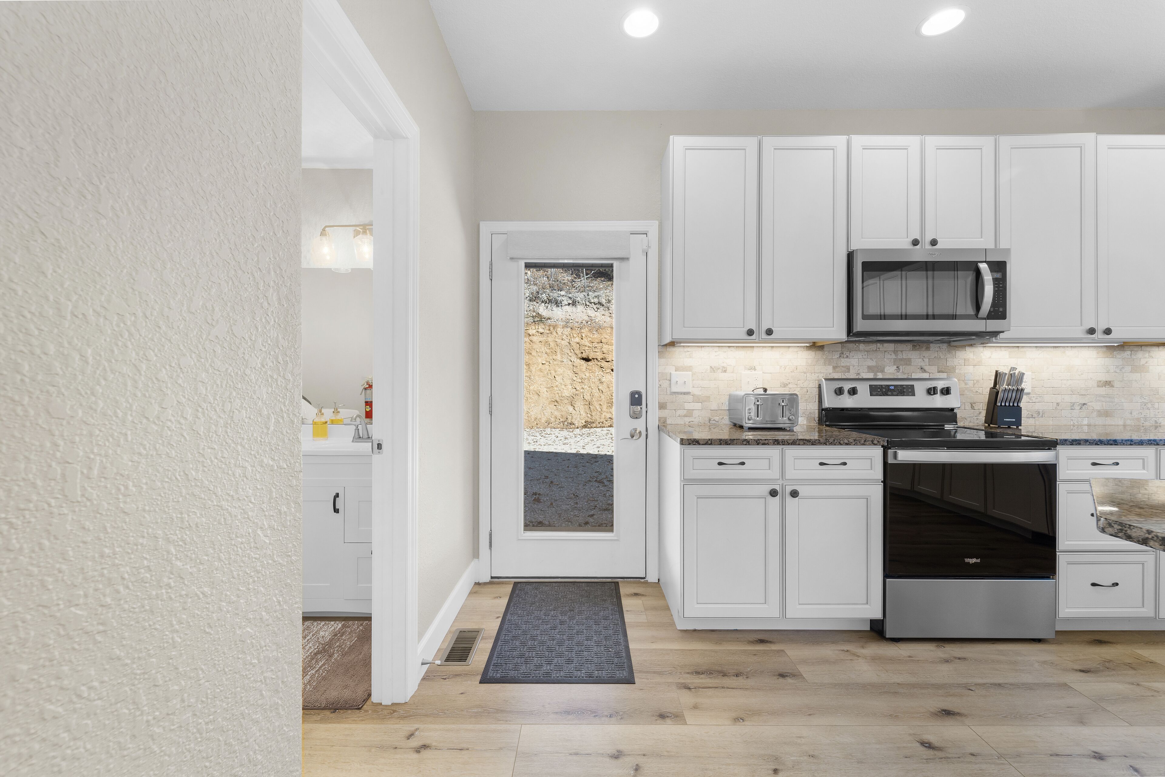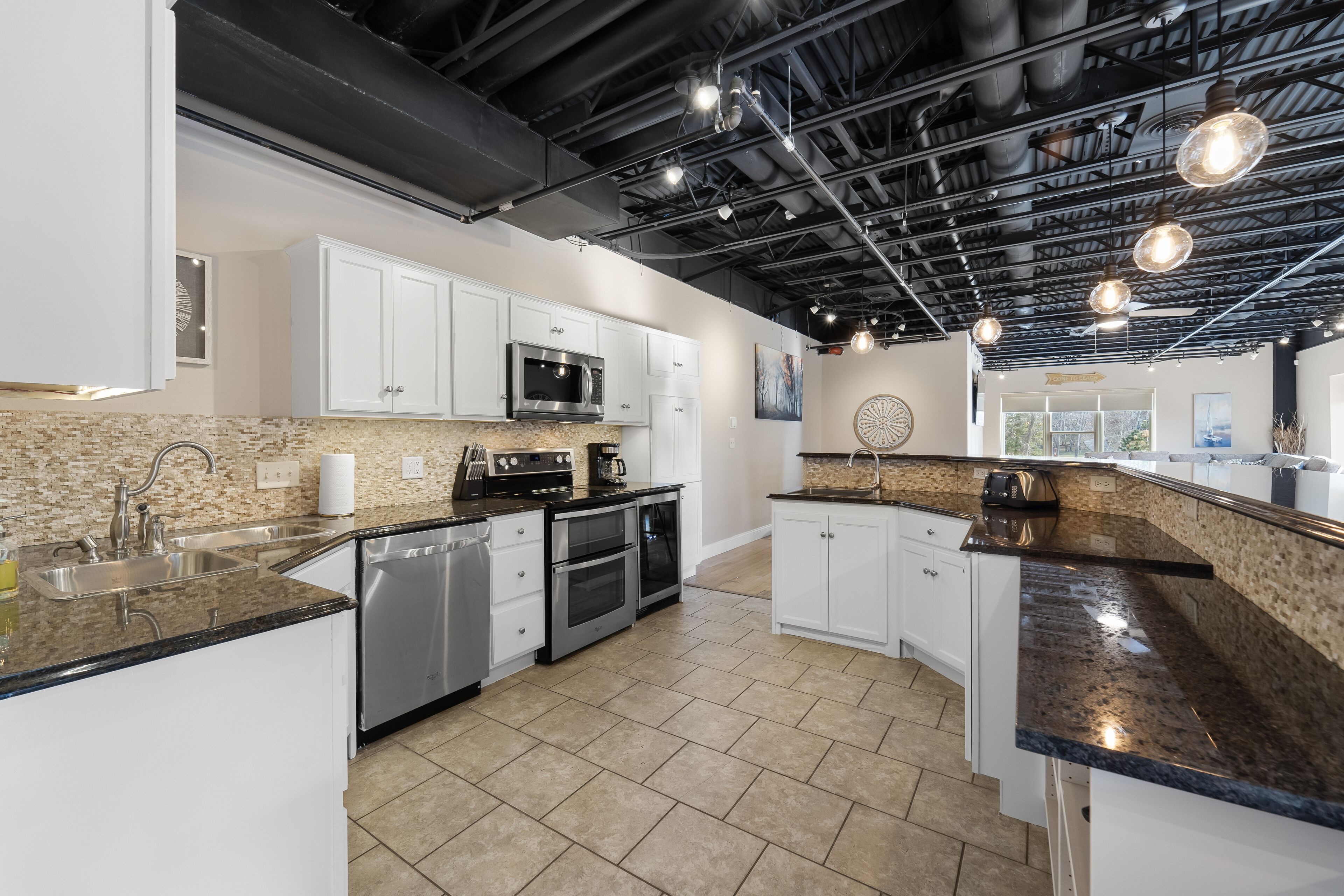 The open concept kitchen has been beautiful updated , a large breakfast bar with 3 barstools. The kitchen is stocked with all the essentials you need to prepare meals and a Keurig coffee maker!