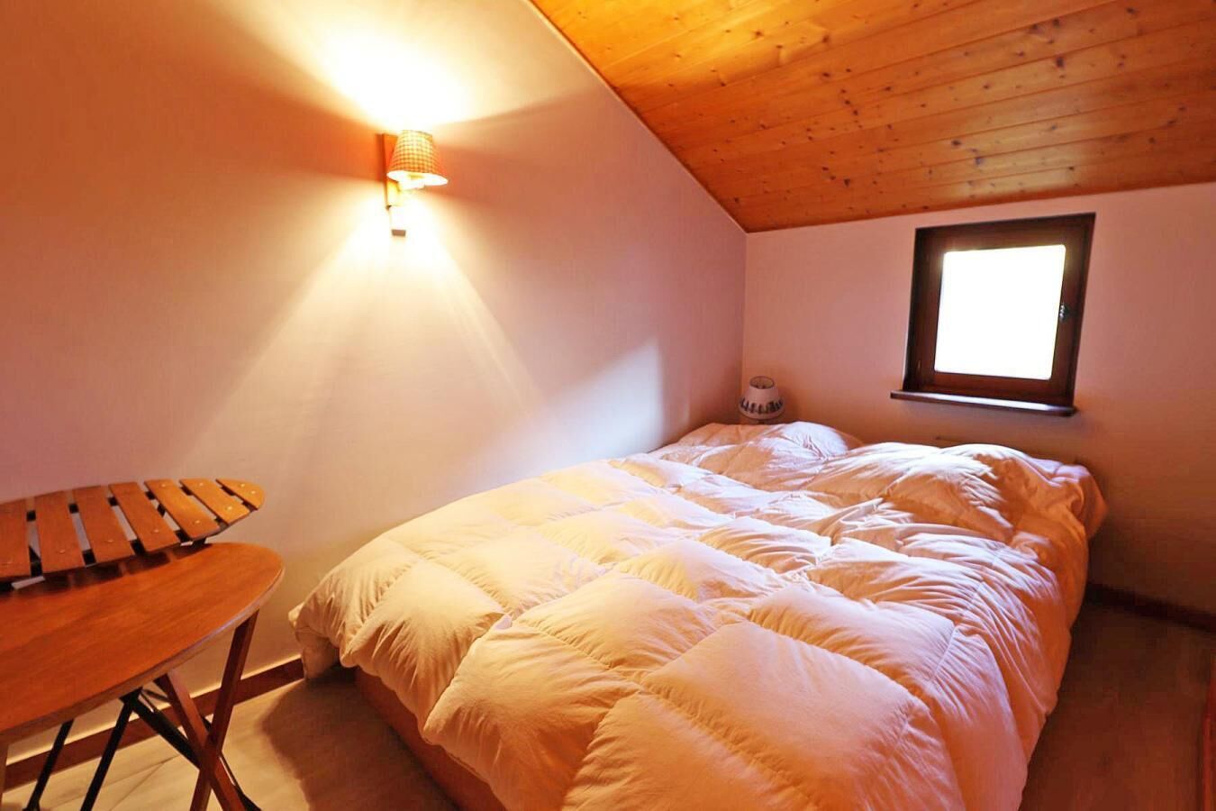 On the mezzanine of the apartment, there is a bedroom area equipped with a double bed, a single bed, and a storage closet. The skylight illuminates the room, offering pleasant brightness (not cleared of snow in winter).