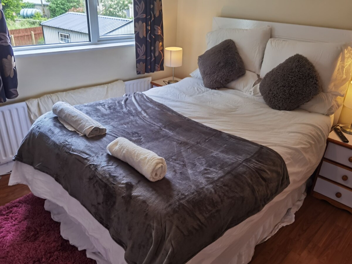 FREE on street parking!!! The house is in the centre of Letterkenny so NO TAXIS needed. In a very quiet neighborhood but only 2 minutes from the main street right next to all the pubs and shopping centres. With super fast WI-Fi. All new Pillows and Bed linen. It's a very CLEAN and Warm place to stay. The beds are very comfy. There are 2 double beds 1 is en suite. And 1 single bed which will use the main bathroom. Can easily sleep 5. Both bathrooms have showers. Feel free to ask me any questions