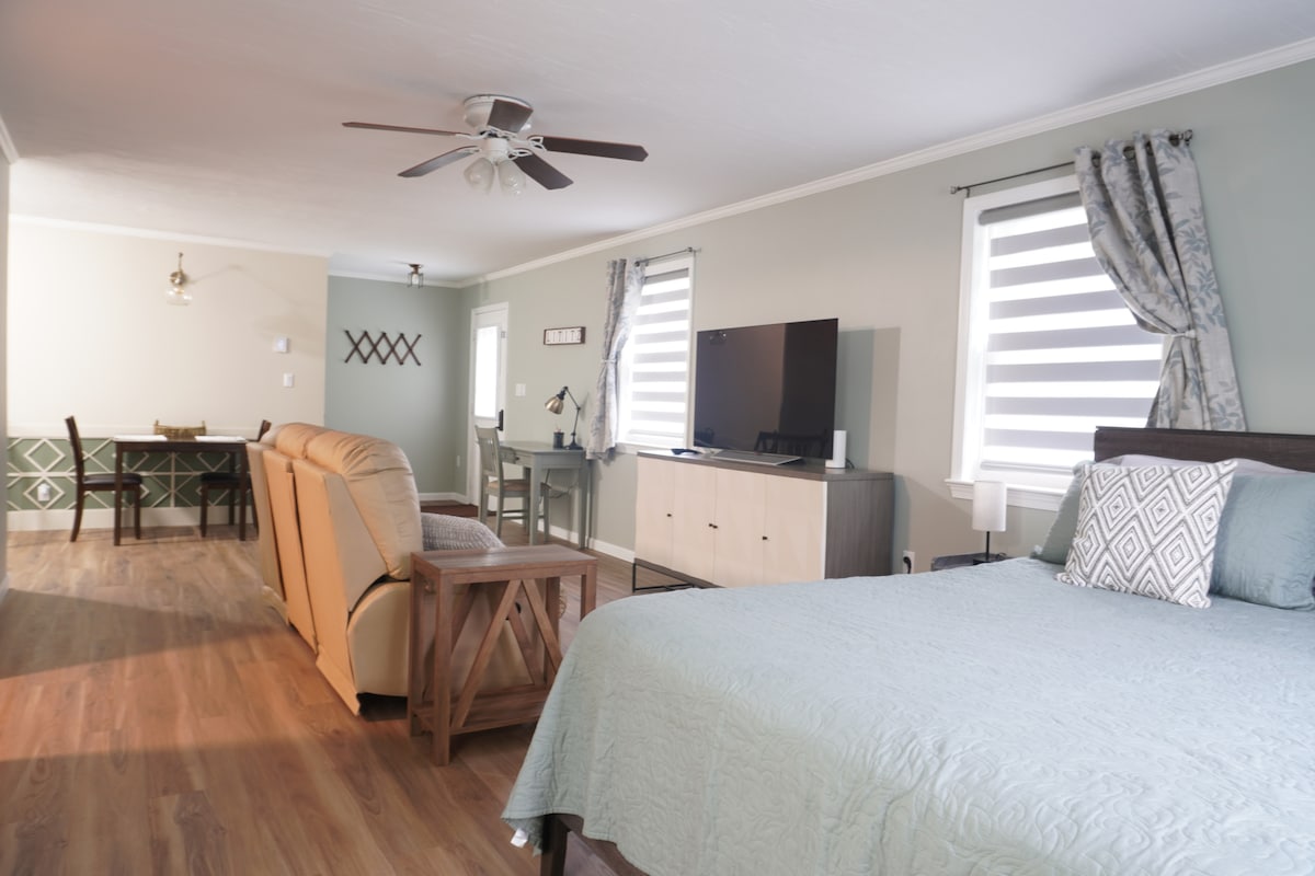 The loft is a modern, studio-style room located on the top floor of the carriage house/detached garage. There is a private entrance. The space consists of a bedroom/living area (combined/studio style) and a separate bathroom with a custom tile shower. Coffee, tea & water is provided. Please note this space is not set up for cooking—no kitchen. There are great restaurants nearby for dining or take out. **Parking for ONE VEHICLE only.** EV charging available for a small fee.
