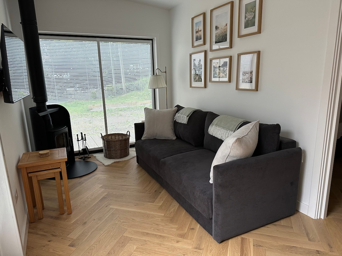 Our cabin sits on its own next door to our home. It has one double bedroom with a king size bed. A fully equipped kitchen and sitting room, with a sofa bed and log burner. Good sized bathroom with electric shower and underfloor heating. Decking surrounding the cabin, catches the sun all day. Where there’s a table and chairs.