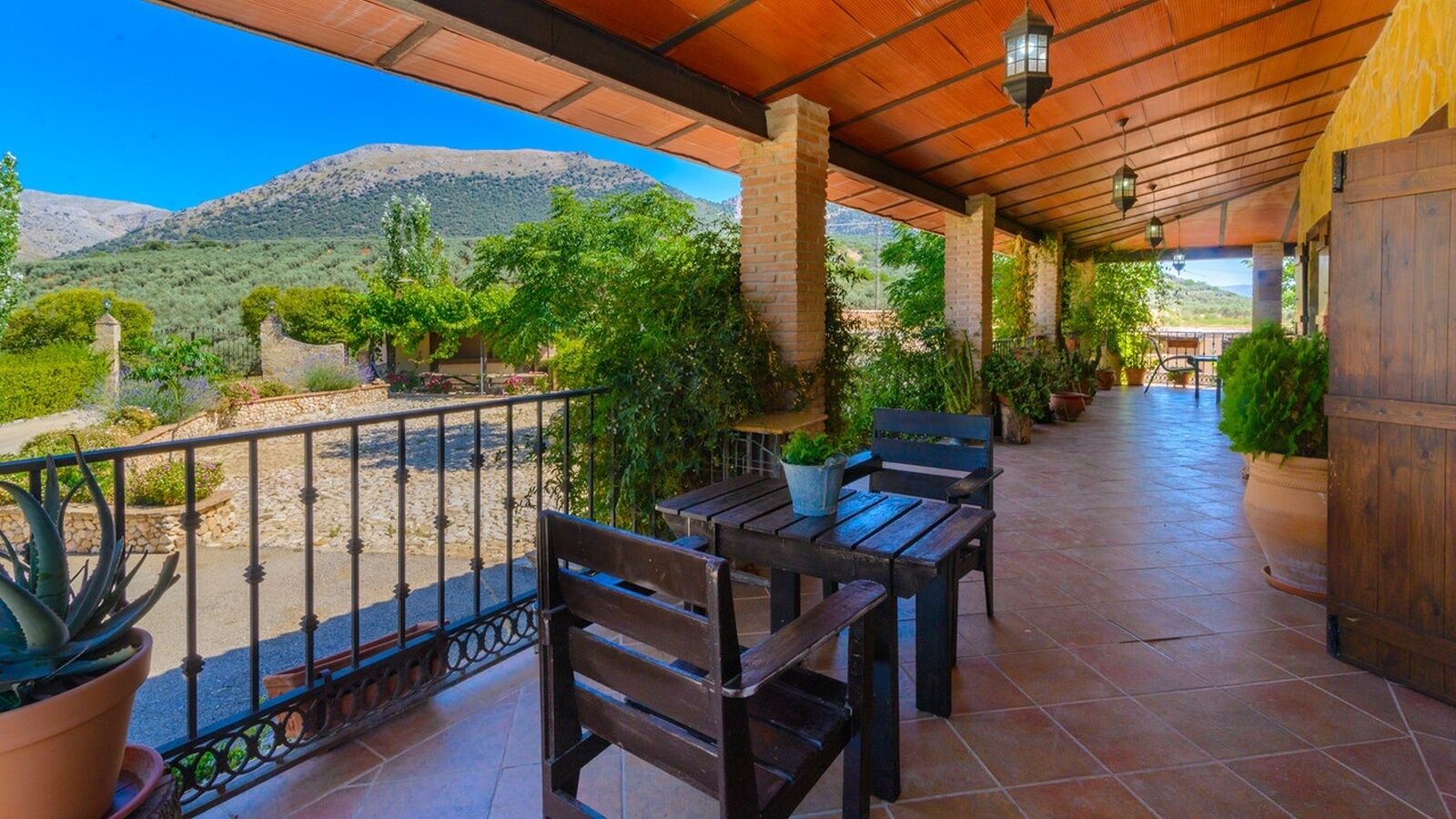 Directly outside the kitchen a wide porch runs along the length of the house. To the right of the doors a long tiled dining table and chairs, to the left yet another sitting area with sofas which is a lovely spot to enjoy a glass of wine or to eat outside in the fresh air.