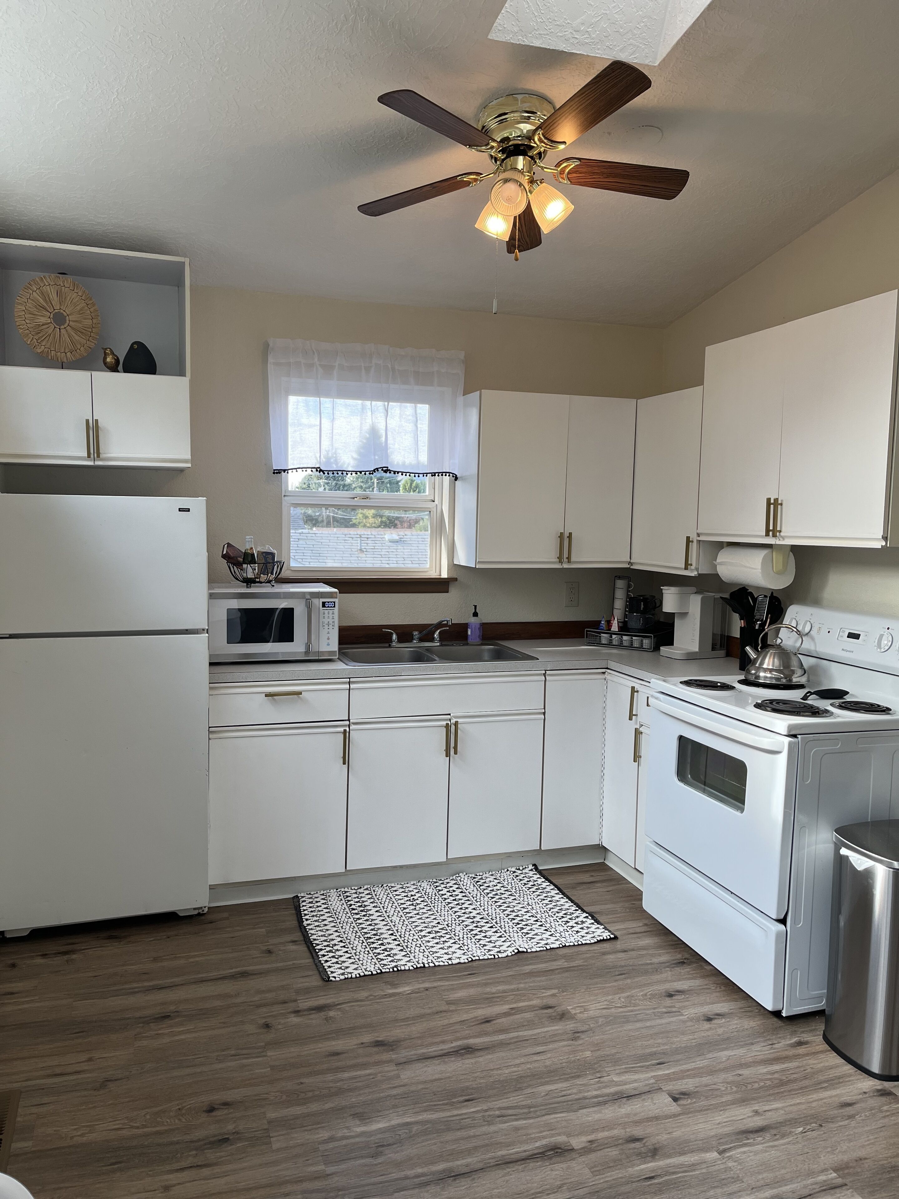 The kitchen is fully stocked with dishes, pans, utensils, Coffee maker. Full pot or k-cups, and cooking basics.