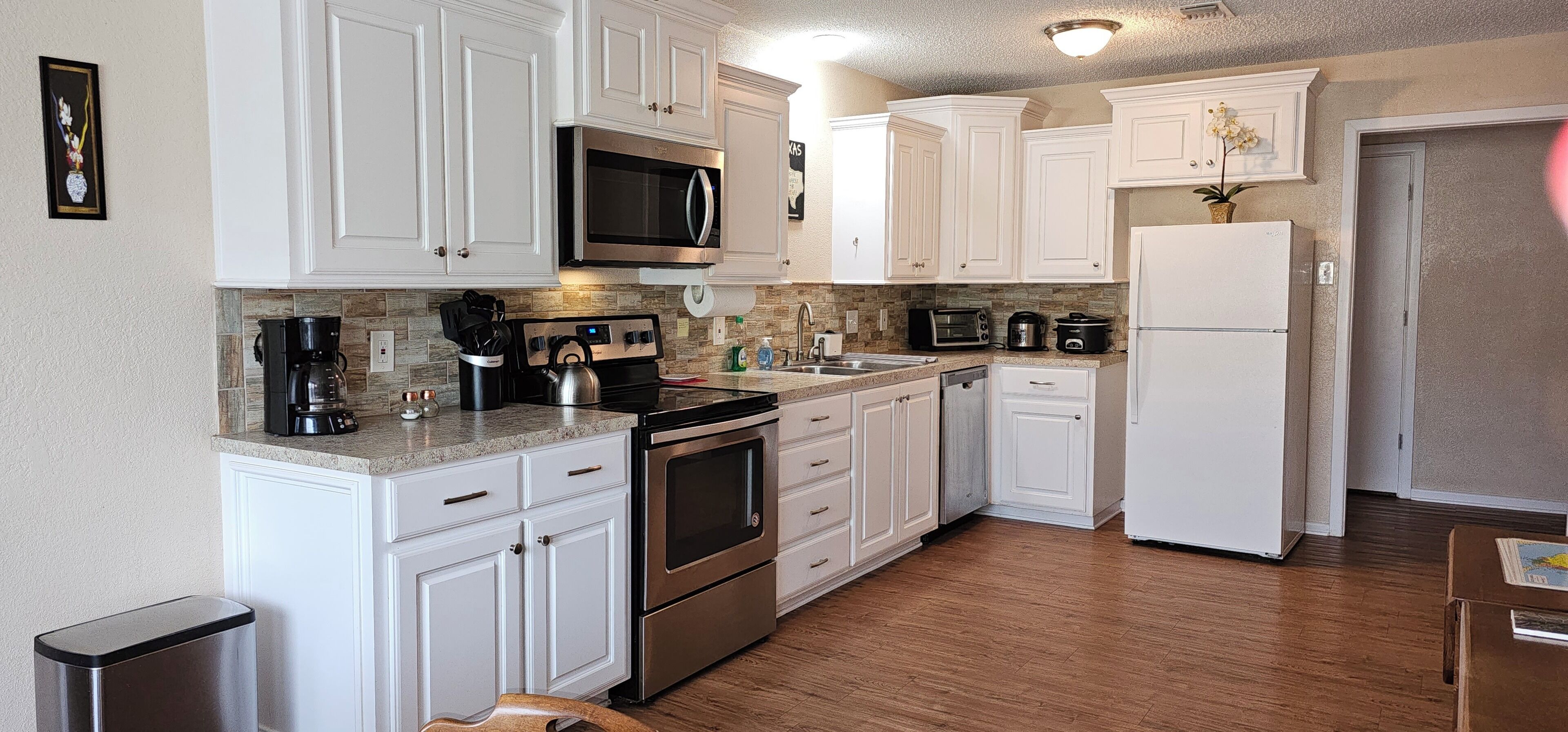 The kitchen is fully equipped with new stainless appliances as well as all of the necessary kitchenware to serve you and your guest. The kitchen and living room are open, making for a comfortable area to relax and entertain.