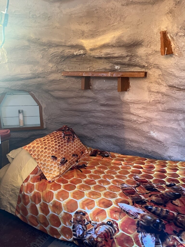 Made out of sand bags,recycled car parts,cooking utensils ,big enough for 1 person (as long you are not 6'4).Build by English architecture student , this unique single unit makes you feel like a bee queen . Electric outlet and light inside. In cold weather heater is provided. In summer it might get hot , no possibility to have an ac. Wifi is good for streaming but might be not enough to use it for remote work .