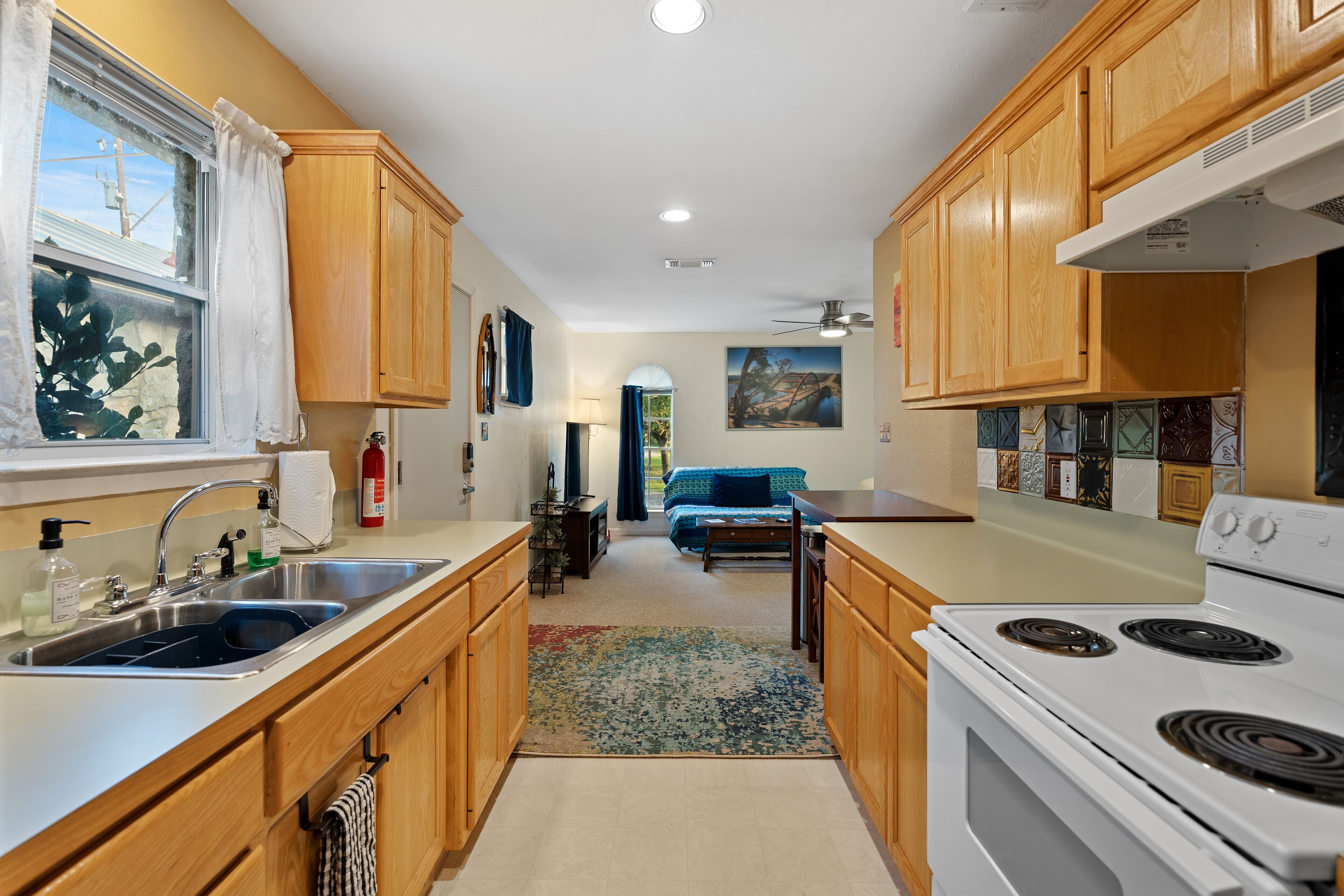 With a modern farm sink and lovely tile work with fun pops of green, guests will find the kitchen offers all the conveniences to make your stay enjoyable. Enjoy a morning cup of coffee or tea with a Keurig coffee maker. This well equipped kitchen is perfect for cooking with family and friends.