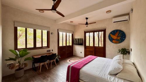 Nice bedroom with a double bed with its mosquito net , fan,. It also has a table to enjoy and work.