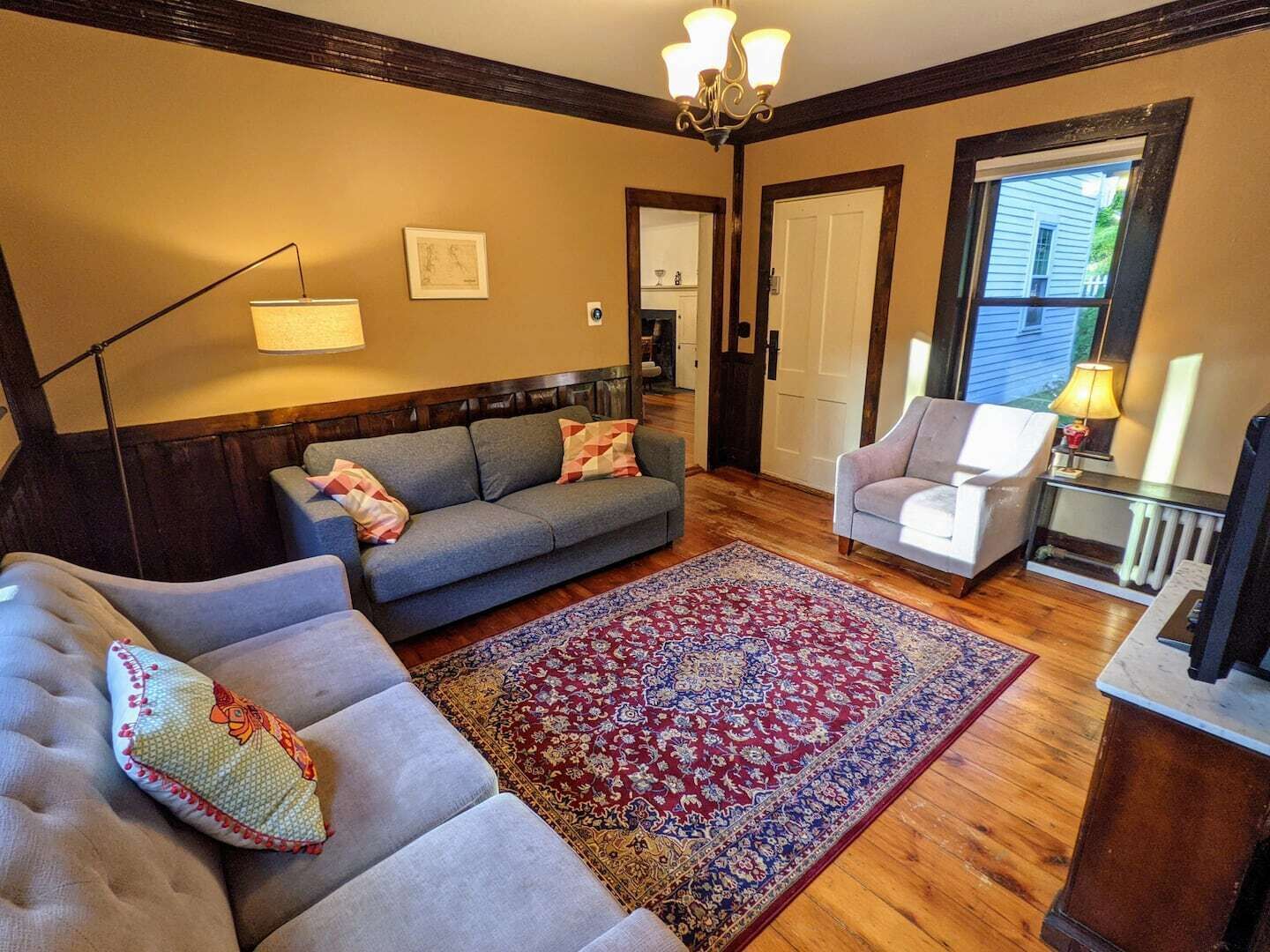 First floor apartment with two bedroom and a sofa bed for extra guests. There are steps to enter the apartment so no wheelchair accessibility. Full service kitchen and 2 dining areas. We are pet friendly and have a dog crate and a fenced in backyard. Wash and dryer are located in the basement as is the second bedroom.